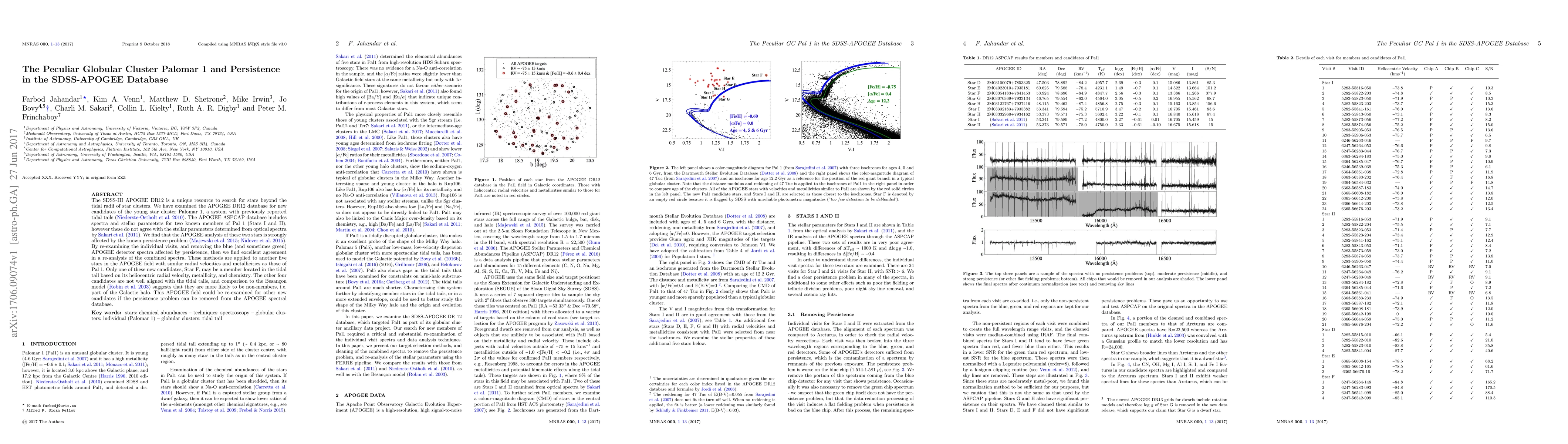 This paper investigates the young globular cluster Palomar 1 using the SDSS-APOGEE DR12 database, finding discrepancies in stellar parameters for known members due to the persistence problem in APOGEE data. After addressing this issue, only one new candidate, Star F, is identified as potentially belonging to the tidal tail of Palomar 1.