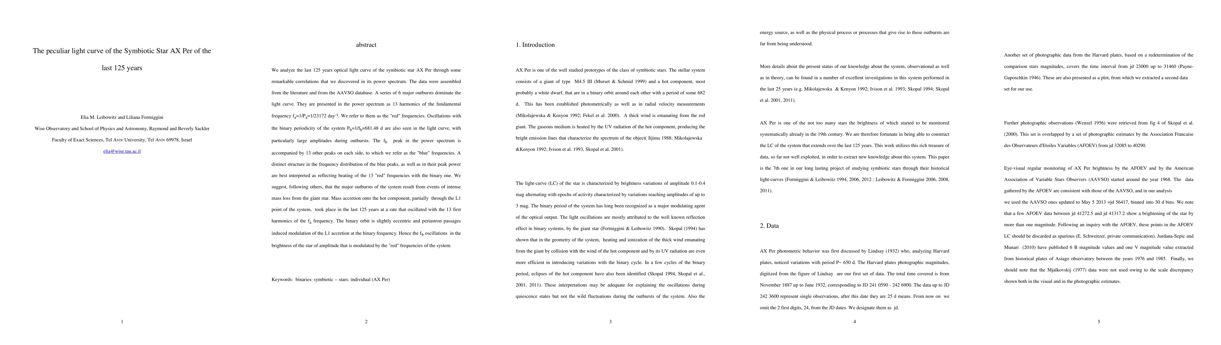 We analyze the last 125 years optical light curve of the symbiotic star AX Per through some remarkable correlations that we discovered in its power spectrum. The data were assembled from the literature and from the AAVSO database. A series of 6 major outbursts dominate the light curve. They are presented in the power spectrum as 13 harmonics of the fundamental frequency fa=1/Pa=1/23172 day-1. We refer to them as the "red" frequencies. Oscillations with the binary periodicity of the system Pb=1/fb=681.48 d are also seen in the light curve, with particularly large amplitudes during outbursts. The fb peak in the power spectrum is accompanied by 13 other peaks on each side, to which we refer as the "blue" frequencies. A distinct structure in the frequency distribution of the blue peaks, as well as in their peak power are best interpreted as reflecting beating of the 13 "red" frequencies with the binary one. We suggest, following others, that the major outbursts of the system result from events of intense mass loss from the giant star. Mass accretion onto the hot component, partially through the L1 point of the system, took place in the last 125 years at a rate that oscillated with the 13 first harmonics of the fa frequency. The binary orbit is slightly eccentric and periastron passages induced modulation of the L1 accretion at the binary frequency. Hence the fb oscillations in the brightness of the star of amplitude that is modulated by the "red" frequencies of the system.