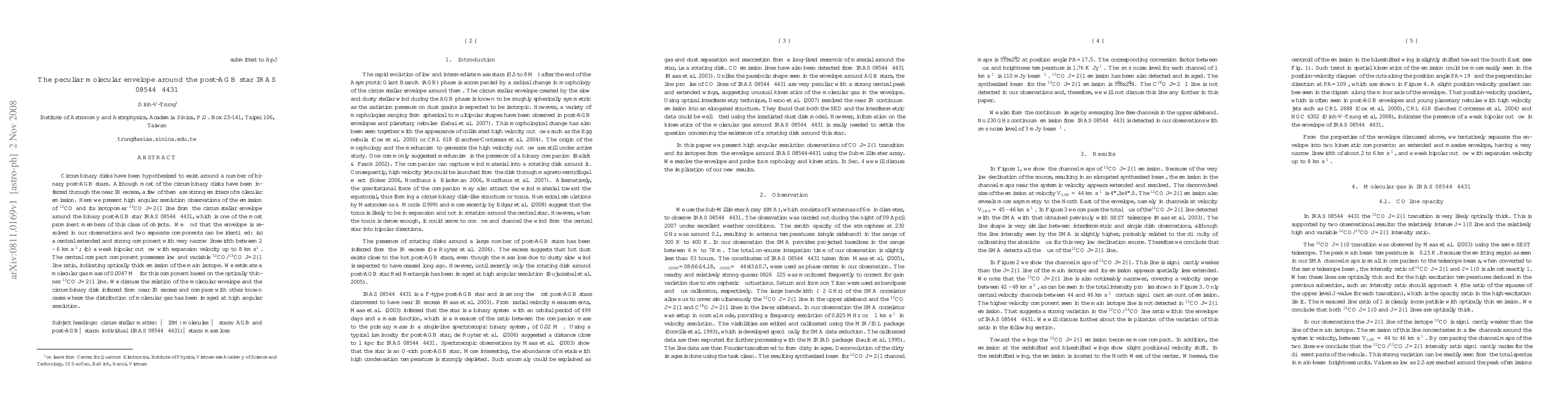 This paper presents high-resolution observations of molecular emission around the post-AGB star IRAS 08544-4431, revealing a resolved envelope with a central strong component and a bipolar outflow. The central component shows low and variable $^{12}$CO/$^{13}$CO ratios, suggesting optically thick emission, and a molecular gas mass of 0.0047 M$_\odot$.