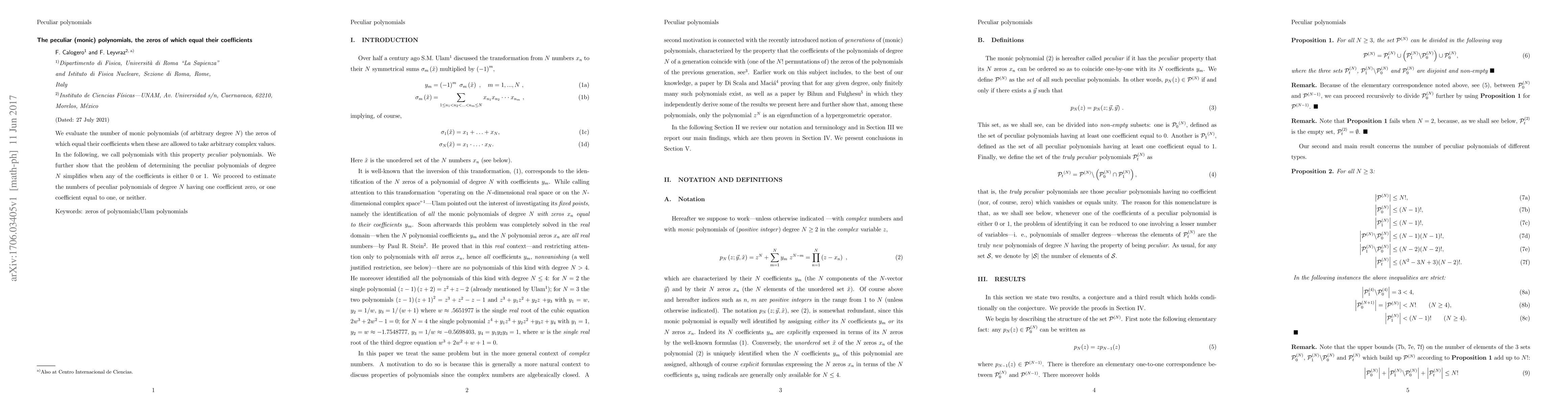 We evaluate the number of monic polynomials (of arbitrary degree $N$) the zeros of which equal their coefficients when these are allowed to take arbitrary complex values. In the following, we call polynomials with this property {\em peculiar\/} polynomials. We further show that the problem of determining the peculiar polynomials of degree $N$ simplifies when any of the coefficients is either 0 or 1. We proceed to estimate the numbers of peculiar polynomials of degree $N$ having one coefficient zero, or one coefficient equal to one, or neither.