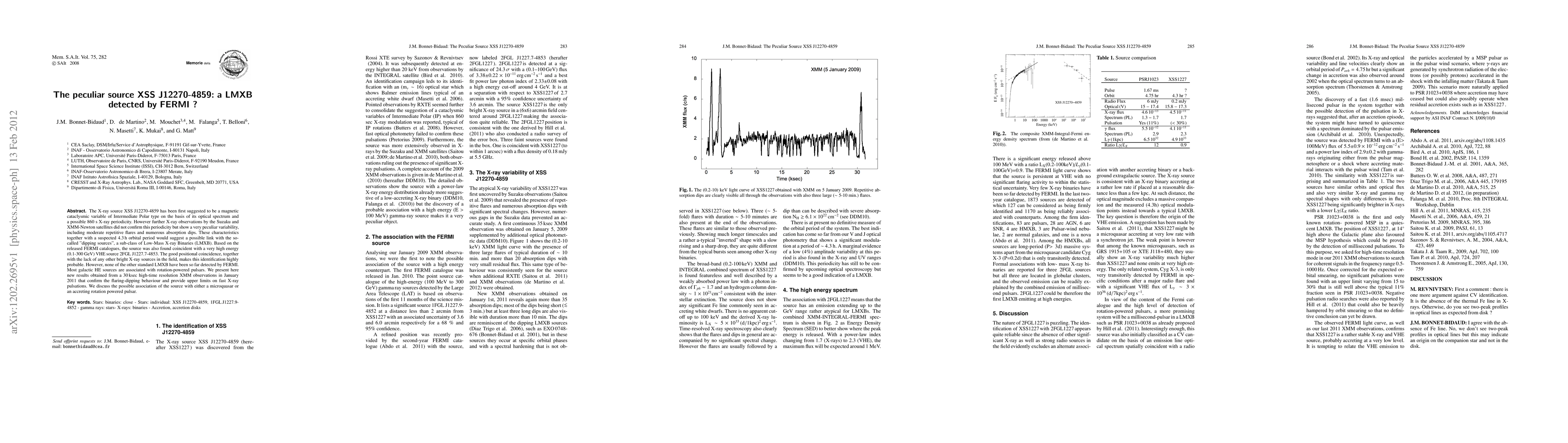 The X-ray source XSS J12270-4859 has been first suggested to be a magnetic cataclysmic variable of Intermediate Polar type on the basis of its optical spectrum and a possible 860 s X-ray periodicity. However further X-ray observations by the Suzaku and XMM-Newton satellites did not confirm this periodicity but show a very peculiar variability, including moderate repetitive flares and numerous absorption dips. These characteristics together with a suspected 4.3 h orbital period would suggest a possible link with the so- called "dipping sources", a sub-class of Low-Mass X-ray Binaries (LMXB). Based on the released FERMI catalogues, the source was also found coincident with a very high energy (0.1-300 GeV) VHE source 2FGL J1227.7-4853. The good positional coincidence, together with the lack of any other bright X-ray sources in the field, makes this identification highly probable. However, none of the other standard LMXBs have been so far detected by FERMI. Most galactic VHE sources are associated with rotation-powered pulsars. We present here new results obtained from a 30 ksec high-time resolution XMM observations in January 2011 that confirm the flaring-dipping behaviour and provide upper limits on fast X-ray pulsations. We discuss the possible association of the source with either a microquasar or an accreting rotation powered pulsar.
