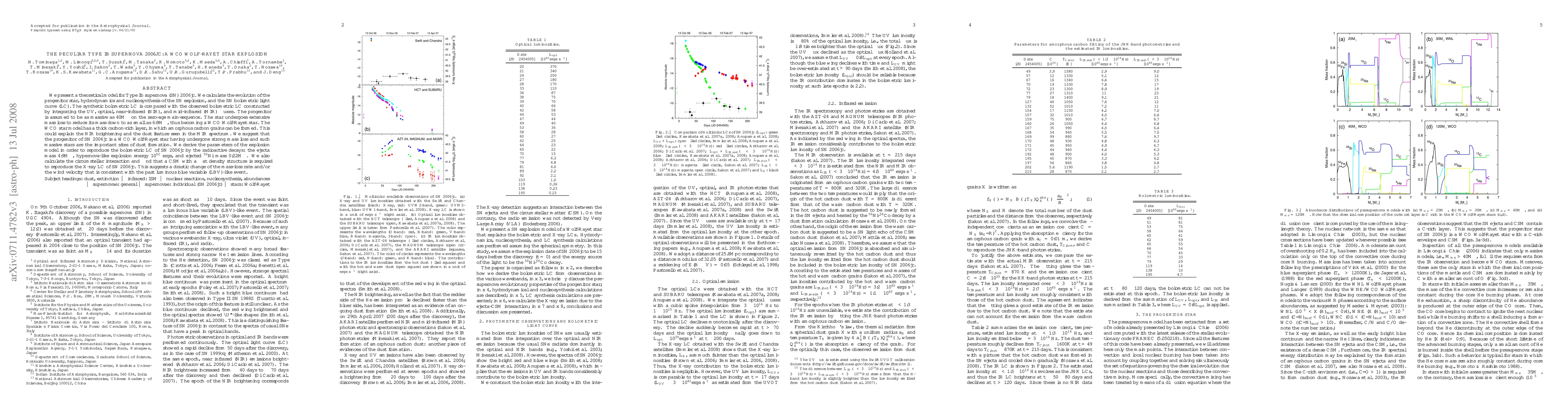 The paper proposes a theoretical model for the peculiar Type Ib supernova 2006jc, suggesting its progenitor was a massive Wolf-Rayet star (WCO type) that underwent significant mass loss, reducing its mass from 40 solar masses to 6.9. The model explains the observed NIR brightening and MIR dust feature, attributing them to amorphous carbon grains formed in the thick carbon-rich layer. The explosion parameters are derived, including ejecta mass of 4.9 solar masses, hypernova-like energy of $10^{52}$ ergs, and 0.22 solar masses of ejected $^{56}$Ni. A flat density circumstellar medium is required to reproduce the X-ray light curve, indicating a drastic change in mass-loss rate or wind velocity consistent with a past LBV-like event.