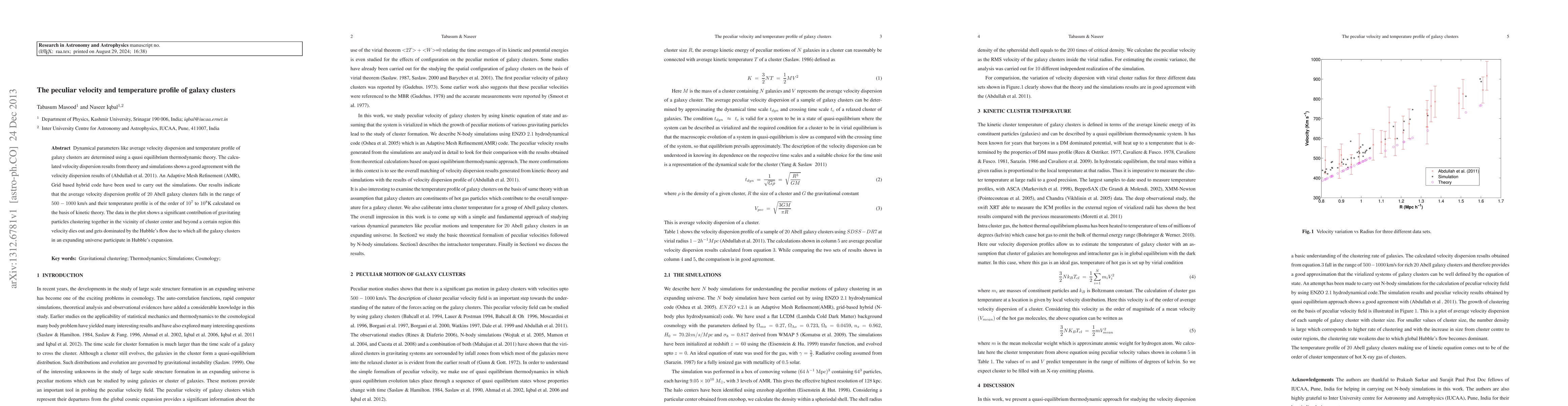 Researchers used a hybrid simulation code to study galaxy clusters, finding that their average velocity dispersion ranges from 500-1000 km/s and temperature profile is around 10^7-10^8K, with velocity dominated by Hubble's expansion beyond a certain point.