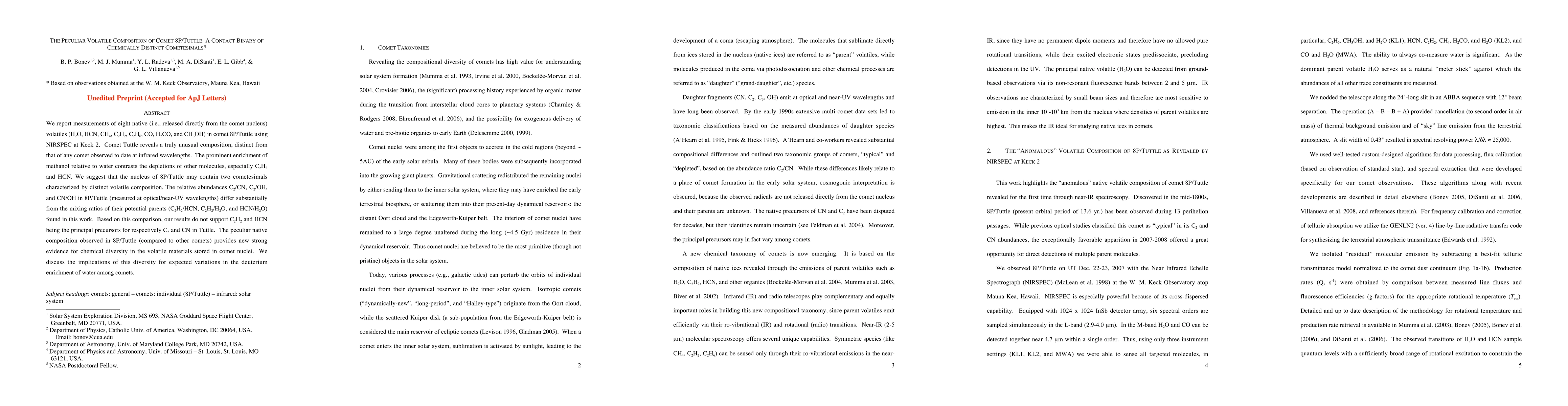 Comet 8P/Tuttle exhibits an unusual volatile composition, notably enriched in methanol relative to water, suggesting a nucleus composed of two chemically distinct cometesimals. This unique composition challenges the idea that C2H2 and HCN are primary precursors for C2 and CN in Tuttle, highlighting significant chemical diversity among cometary nuclei.
