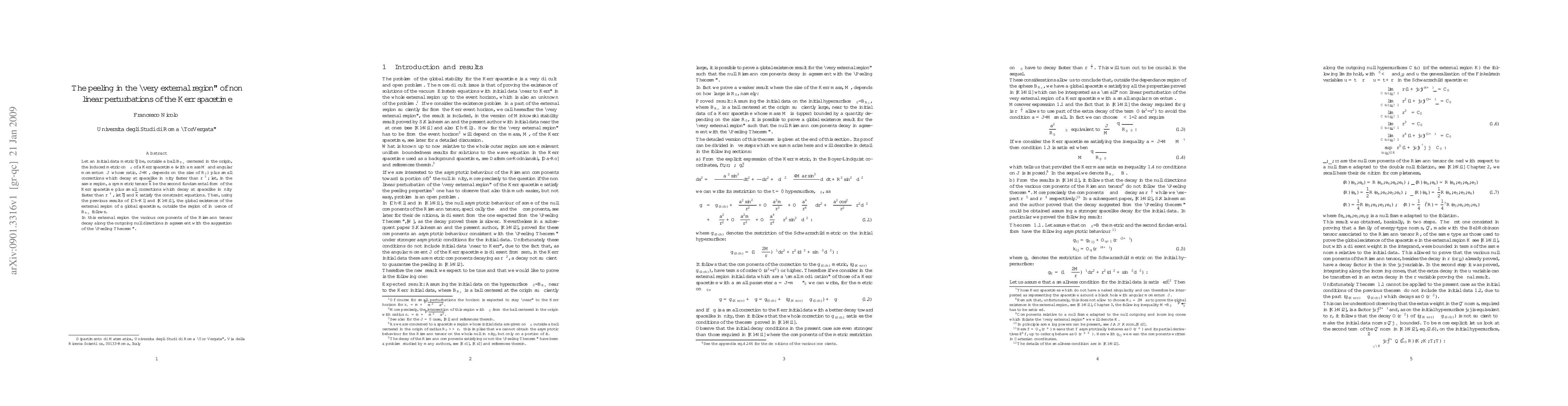 Let an initial data metric $\overline{g}$ be, outside a ball $B_{R_0}$ centered in the origin, the induced metric on $\Sigma_0$ of a Kerr spacetime (with a mass $M$ and angular momentum $J$ whose ratio, $J/M$, depends on the size of $R_0$) plus small corrections which decay at spacelike infinity faster than $r^{-3}$; let, in the same region, a symmetric tensor $\overline{k}$ be the second fundamental form of the Kerr spacetime plus small corrections which decay at spacelike infinity faster than $r^{-4}$, let $\overline{g}$ and $\overline{k}$ satisfy the constraint equations. Then, using the previous results of \cite{Ch-Kl:book} and \cite{Kl-Ni:book}, the global existence of the external region of a global spacetime, outside the region of influence of $B_{R_0}$ follows. In this external region the various components of the Riemann tensor decay along the outgoing null directions in agreement with the "Peeling Theorem".