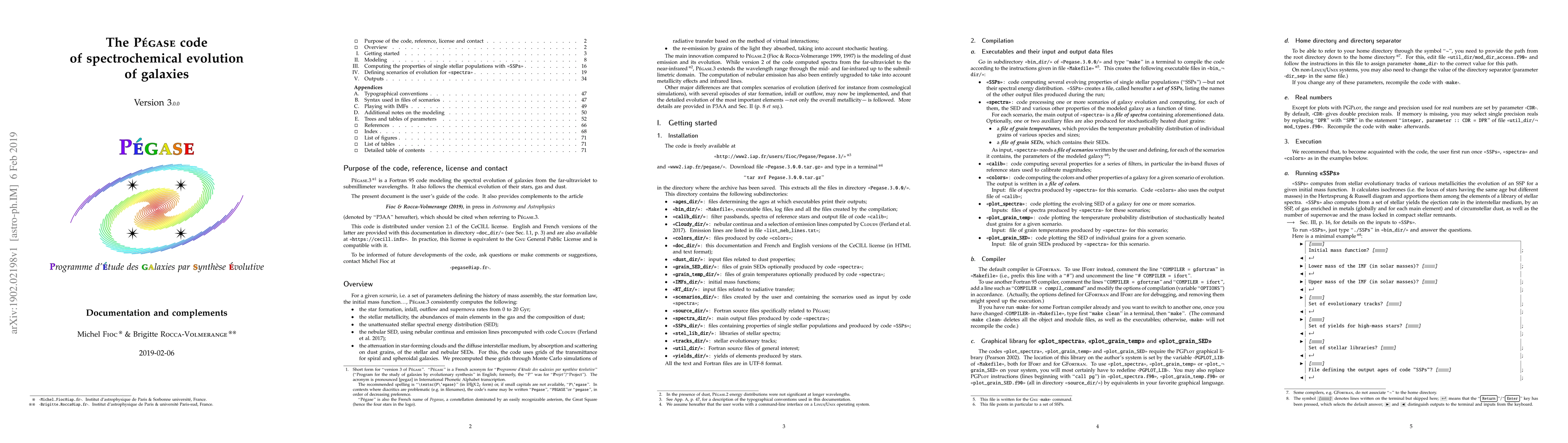 P\'egase.3 is a Fortran 95 code modeling the spectral evolution of galaxies from the far-ultraviolet to submillimeter wavelengths. It also follows the chemical evolution of their stars, gas and dust. For a given scenario (a set of parameters defining the history of mass assembly, the star formation law, the initial mass function...), P\'egase.3 consistently computes the following: * the star formation, infall, outflow and supernova rates from 0 to 20 Gyr; * the stellar metallicity, the abundances of main elements in the gas and the composition of dust; * the unattenuated stellar spectral energy distribution (SED); * the nebular SED, using nebular continua and emission lines precomputed with code Cloudy (Ferland et al. 2017); * the attenuation in star-forming clouds and the diffuse interstellar medium, by absorption and scattering on dust grains, of the stellar and nebular SEDs. For this, the code uses grids of the transmittance for spiral and spheroidal galaxies. We precomputed these grids through Monte Carlo simulations of radiative transfer based on the method of virtual interactions; * the re-emission by grains of the light they absorbed, taking into account stochastic heating. The main innovation compared to P\'egase.2 is the modeling of dust emission and its evolution. The computation of nebular emission has also been entirely upgraded to take into account metallicity effects and infrared lines. Other major differences are that complex scenarios of evolution (derived for instance from cosmological simulations), with several episodes of star formation, infall or outflow, may now be implemented, and that the detailed evolution of the most important elements -- not only the overall metallicity -- is followed.