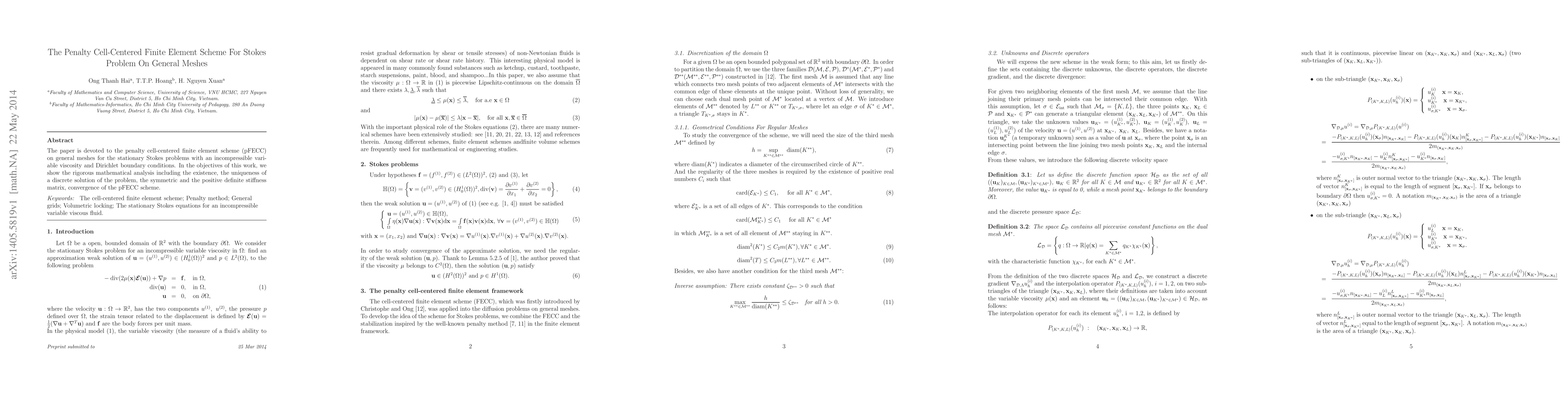 The paper presents a penalty cell-centered finite element scheme (pFECC) for solving the stationary Stokes problem on general meshes, focusing on variable viscosity and Dirichlet boundary conditions. It provides a rigorous mathematical analysis demonstrating the existence, uniqueness, and convergence of the proposed pFECC scheme.