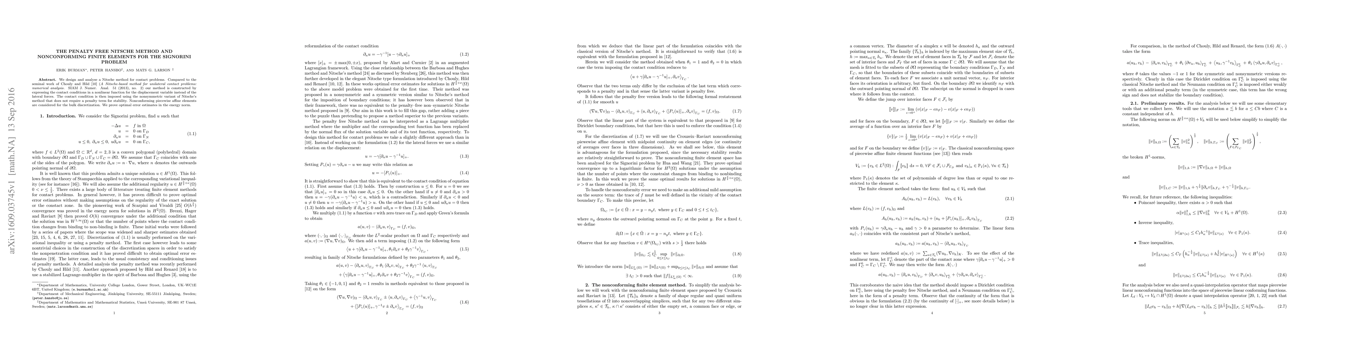 Researchers developed a new Nitsche method for contact problems without penalty terms, using nonconforming piecewise affine elements to achieve optimal error estimates in the energy norm.