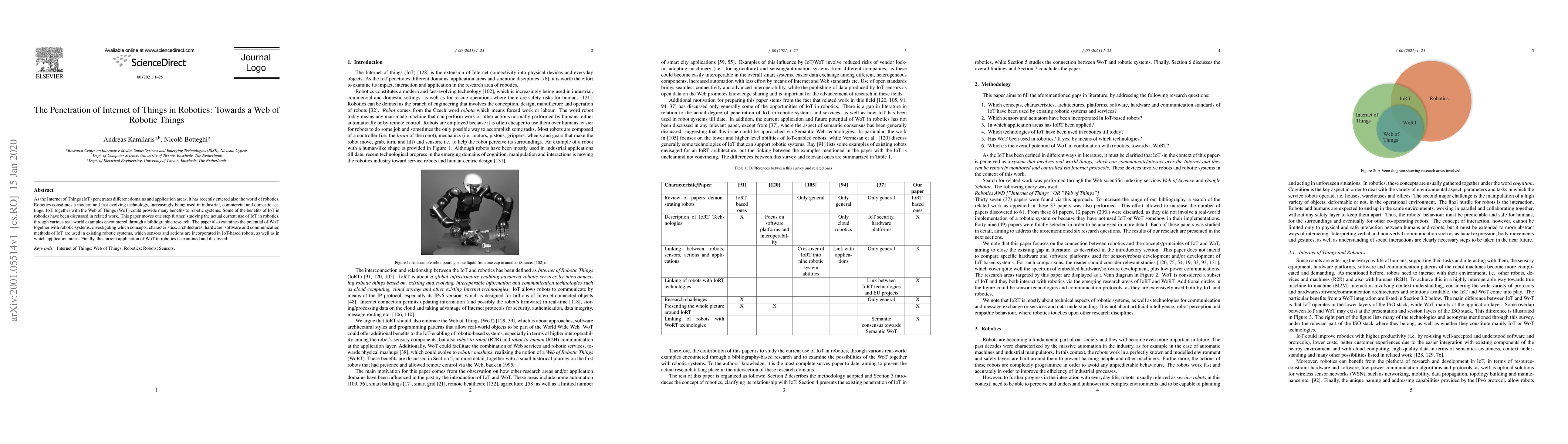 As the Internet of Things (IoT) penetrates different domains and application areas, it has recently entered also the world of robotics. Robotics constitutes a modern and fast-evolving technology, increasingly being used in industrial, commercial and domestic settings. IoT, together with the Web of Things (WoT) could provide many benefits to robotic systems. Some of the benefits of IoT in robotics have been discussed in related work. This paper moves one step further, studying the actual current use of IoT in robotics, through various real-world examples encountered through a bibliographic research. The paper also examines the potential ofWoT, together with robotic systems, investigating which concepts, characteristics, architectures, hardware, software and communication methods of IoT are used in existing robotic systems, which sensors and actions are incorporated in IoT-based robots, as well as in which application areas. Finally, the current application of WoT in robotics is examined and discussed.