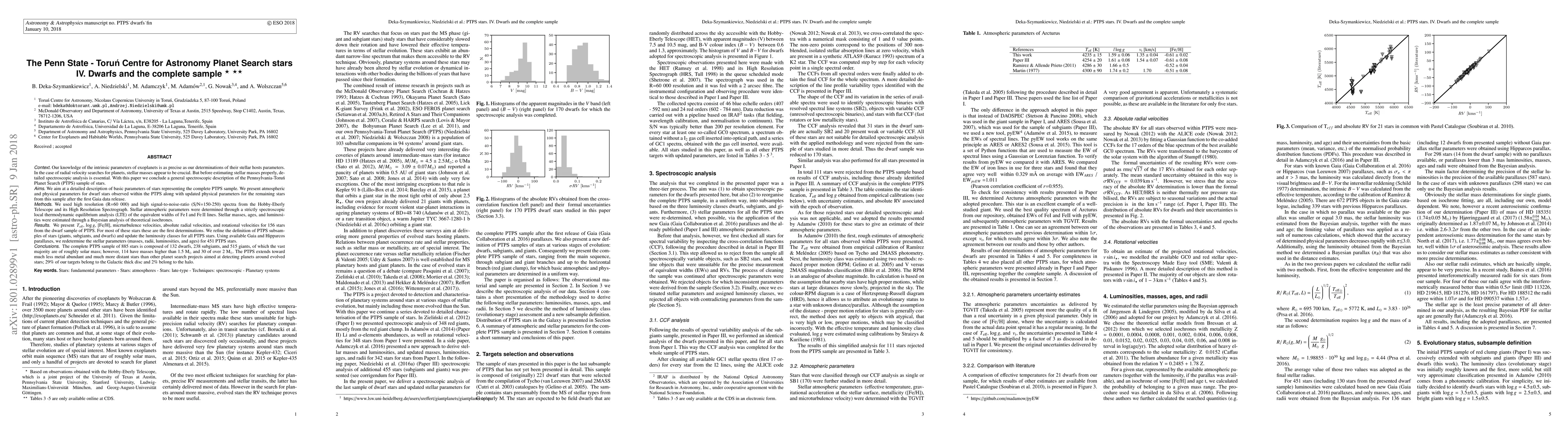 Our knowledge of the intrinsic parameters of exoplanets is as precise as our determinations of their stellar hosts parameters. In the case of radial velocity searches for planets, stellar masses appear to be crucial. But before estimating stellar masses properly, detailed spectroscopic analysis is essential. With this paper we conclude a general spectroscopic description of the Pennsylvania-Torun Planet Search (PTPS) sample of stars. We aim at a detailed description of basic parameters of stars representing the complete PTPS sample. We present atmospheric and physical parameters for dwarf stars observed within the PTPS along with updated physical parameters for the remaining stars from this sample after the first Gaia data release. We used high resolution (R=60 000) and high signal-to-noise-ratio (S/N=150-250) spectra from the Hobby-Eberly Telescope and its High Resolution Spectrograph. Stellar atmospheric parameters were determined through a strictly spectroscopic local thermodynamic equilibrium analysis (LTE) of the equivalent widths of FeI and FeII lines. Stellar masses, ages, and luminosities were estimated through a Bayesian analysis of theoretical isochrones. We present $T_{eff}$, log$g$ , [Fe/H], micrturbulence velocities, absolute radial velocities, and rotational velocities for 156 stars from the dwarf sample of PTPS. For most of these stars these are the first determinations. We refine the definition of PTPS subsamples of stars (giants, subgiants, and dwarfs) and update the luminosity classes for all PTPS stars. Using available Gaia and Hipparcos parallaxes, we redetermine the stellar parameters (masses, radii, luminosities, and ages) for 451 PTPS stars. The complete PTPS sample of 885 stars is composed of 132 dwarfs, 238 subgiants, and 515 giants, of which the vast majority are of roughly solar mass.