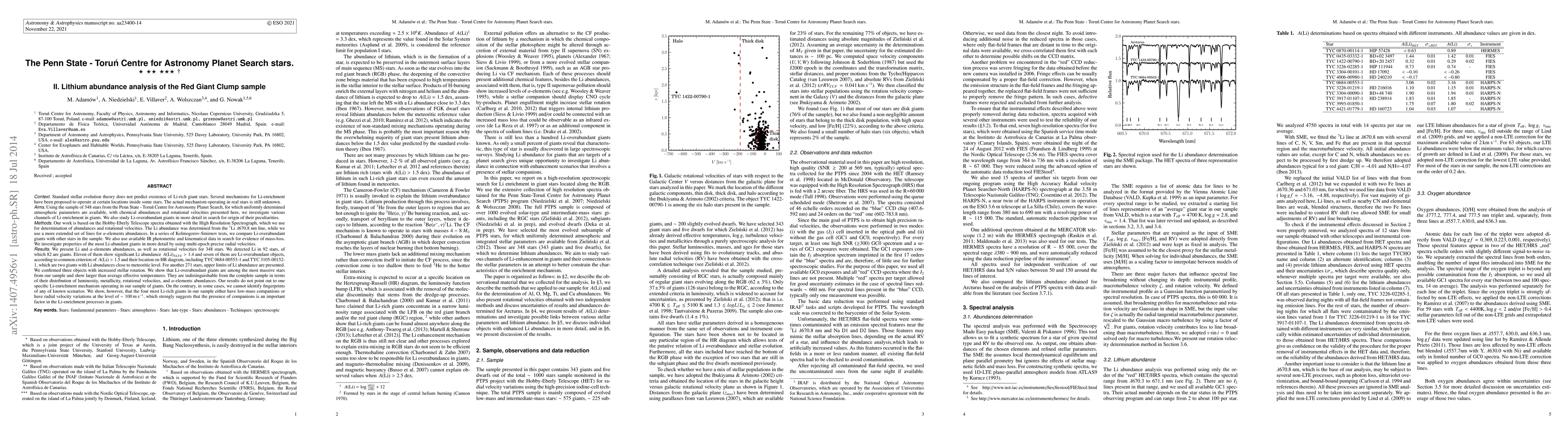 Using the sample of 348 stars from the PennState-Torun Centre for Astronomy Planet Search, for which uniformly determined atmospheric parameters are available, with chemical abundances and rotational velocities presented here, we investigate various channels of Li enrichment in giants. Our work is based on the HET/HRS spectra. The A(Li) was determined from the 670.8nm line, while we use a more extended set of lines for alpha-elements abundances. In a series of K-S tests, we compare Li-rich giants with other stars in the sample. We also use available IR photometric and kinematical data in search for evidence of mass-loss. We investigate properties of the most Li-abundant giants in more detail by using multi-epoch precise radial velocities. We present Li and alpha-elements abundances, as well as vsini for 348 stars. We detected Li in 92 stars, of which 82 are giants. 11 of them show significant Li abundance A(Li)>1.4 and 7 of them are Li-overabundant objects, according to criterion of A(Li)>1.5 and their location on HR diagram, including two giants with Li abundances close to meteoritic level. For another 271 stars, upper limits of A(Li) are presented. We show that Li-rich giants are among the most massive stars from our sample and show larger than average effective temperatures. They are indistinguishable from the complete sample in terms of their distribution of luminosity, [Fe/H], vsini, and alpha-elements abundances. Our results do not point out to one specific Li enrichment mechanism operating in our sample of giants. On the contrary, in some cases, we cannot identify fingerprints of any of known scenarios. We show, however, that the 4 most Li-rich giant in our sample either have low-mass companions or have RV variations at the level of ~100 m/s, which strongly suggests that the presence of companions is an important factor in the Li-enrichment processes in giants.