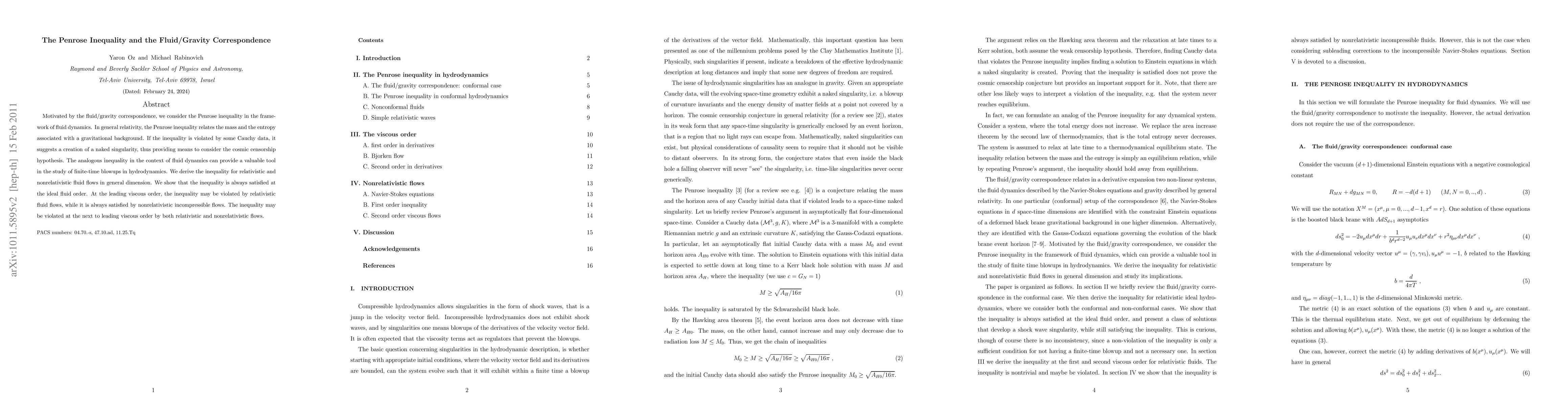 Motivated by the fluid/gravity correspondence, we consider the Penrose inequality in the framework of fluid dynamics. In general relativity, the Penrose inequality relates the mass and the entropy associated with a gravitational background. If the inequality is violated by some Cauchy data, it suggests a creation of a naked singularity, thus providing means to consider the cosmic censorship hypothesis. The analogous inequality in the context of fluid dynamics can provide a valuable tool in the study of finite-time blowups in hydrodynamics. We derive the inequality for relativistic and nonrelativistic fluid flows in general dimension. We show that the inequality is always satisfied at the ideal fluid order. At the leading viscous order, the inequality may be violated by relativistic fluid flows, while it is always satisfied by nonrelativistic incompressible flows. The inequality may be violated at the next to leading viscous order by both relativistic and nonrelativistic flows.