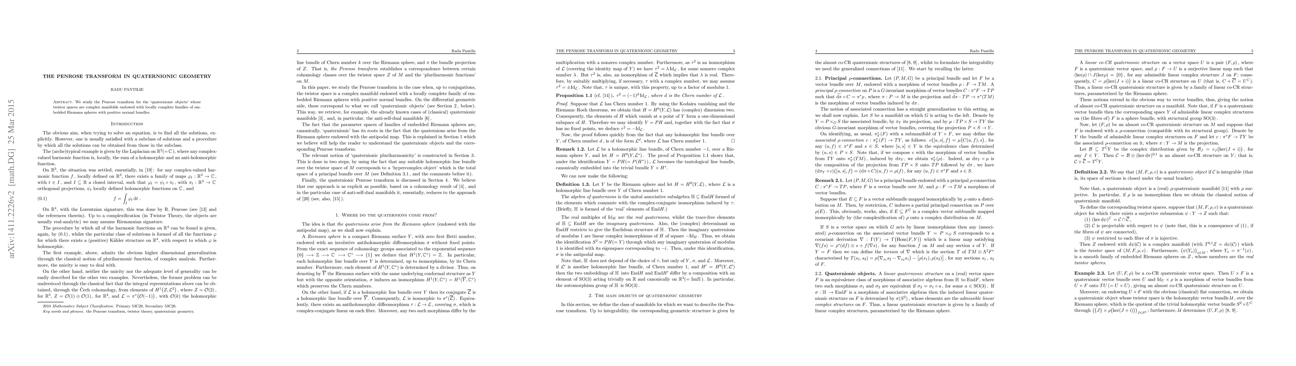 Summary: This paper explores the Penrose transform applied to quaternionic objects characterized by twistor spaces of complex manifolds containing embedded Riemann spheres, focusing on the positive normal bundles of these structures. The study aims to understand the geometric implications of the transform in this context.