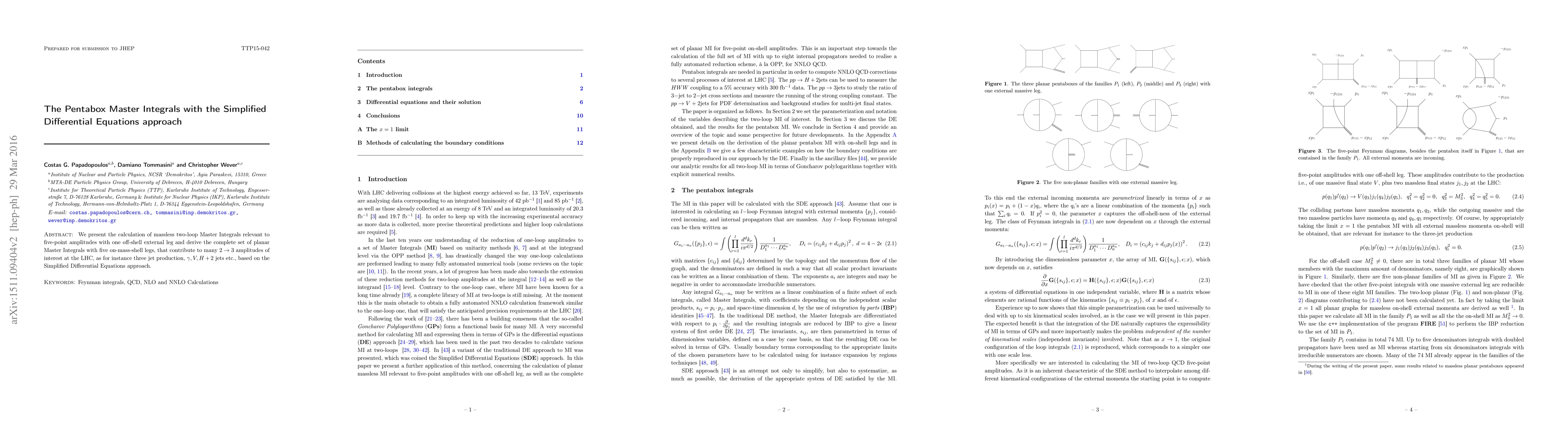 We present the calculation of massless two-loop Master Integrals relevant to five-point amplitudes with one off-shell external leg and derive the complete set of planar Master Integrals with five on-mass-shell legs, that contribute to many $2\to 3$ amplitudes of interest at the LHC, as for instance three jet production, $\gamma, V, H +2$ jets etc., based on the Simplified Differential Equations approach.