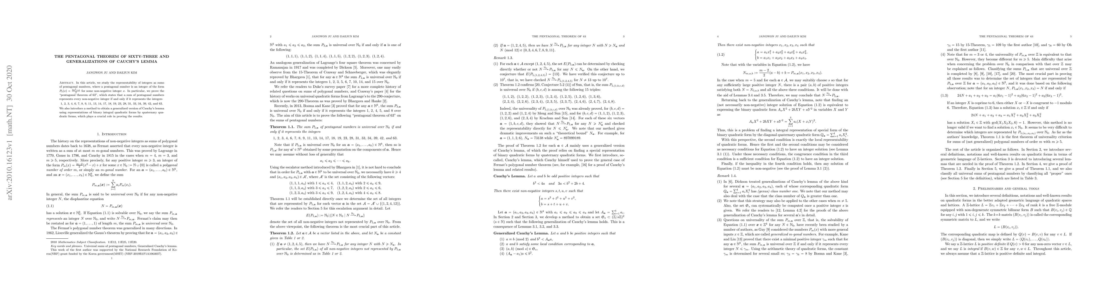In this article, we study the representability of integers as sums of pentagonal numbers, where a pentagonal number is an integer of the form $P_5(x)=\frac{3x^2-x}{2}$ for some non-negative integer $x$. In particular, we prove the "pentagonal theorem of $63$", which states that a sum of pentagonal numbers represents every non-negative integer if and only if it represents the integers $1$, $2$, $3$, $4$, $6$, $7$, $8$, $9$, $11$, $13$, $14$, $17$, $18$, $19$, $23$, $28$, $31$, $33$, $34$, $39$, $42$, and $63$. We also introduce a method to obtain a generalized version of Cauchy's lemma using representations of binary integral quadratic forms by quaternary quadratic forms, which plays a crucial role in proving the results.