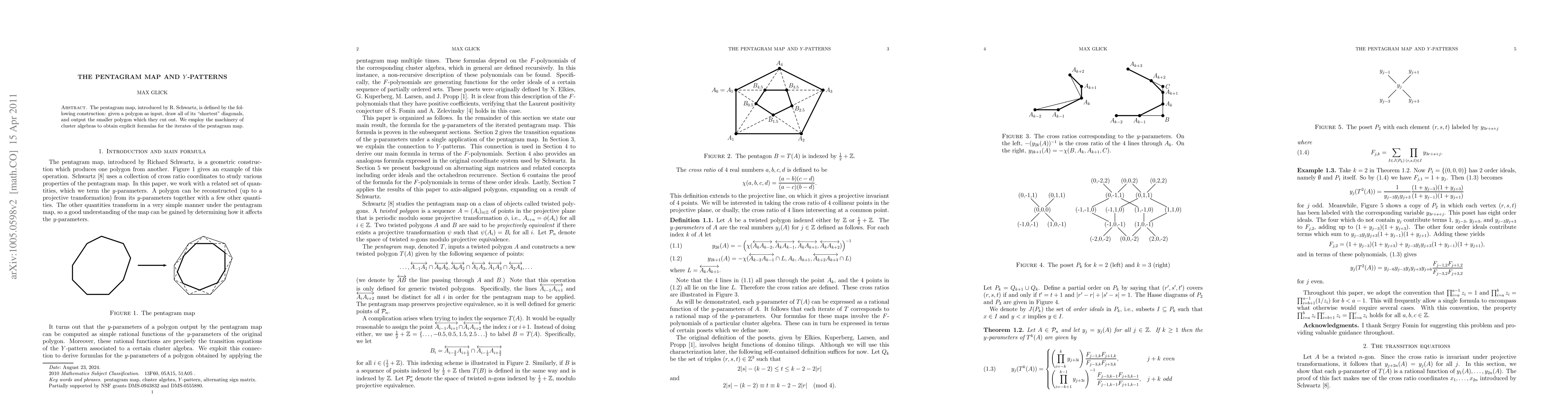 Summary: This paper explores the pentagram map, a transformation on polygons defined by drawing shortest diagonals and extracting a smaller polygon, and uses cluster algebras to derive explicit formulas for its iterates.