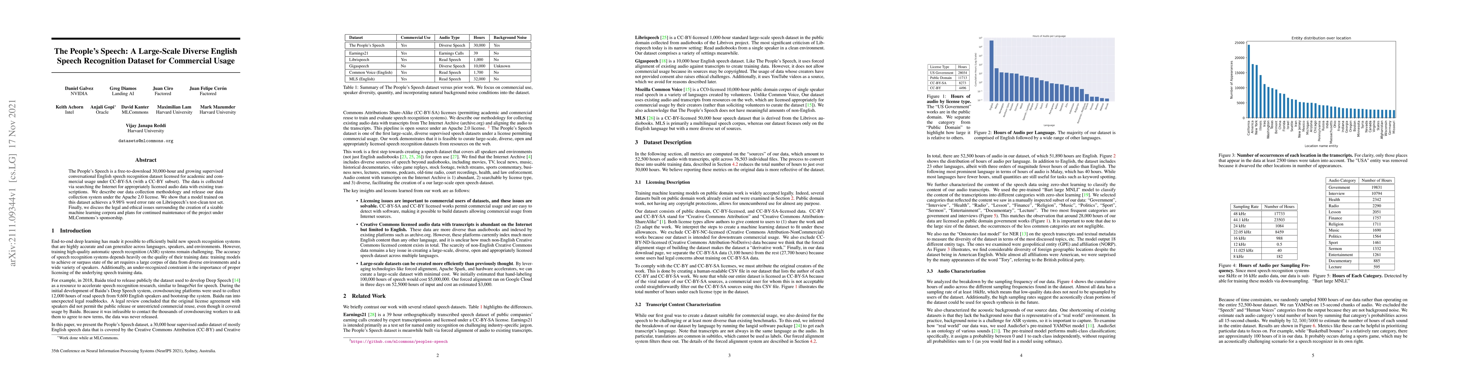 The People's Speech is a free-to-download 30,000-hour and growing supervised conversational English speech recognition dataset licensed for academic and commercial usage under CC-BY-SA (with a CC-BY subset). The data is collected via searching the Internet for appropriately licensed audio data with existing transcriptions. We describe our data collection methodology and release our data collection system under the Apache 2.0 license. We show that a model trained on this dataset achieves a 9.98% word error rate on Librispeech's test-clean test set.Finally, we discuss the legal and ethical issues surrounding the creation of a sizable machine learning corpora and plans for continued maintenance of the project under MLCommons's sponsorship.