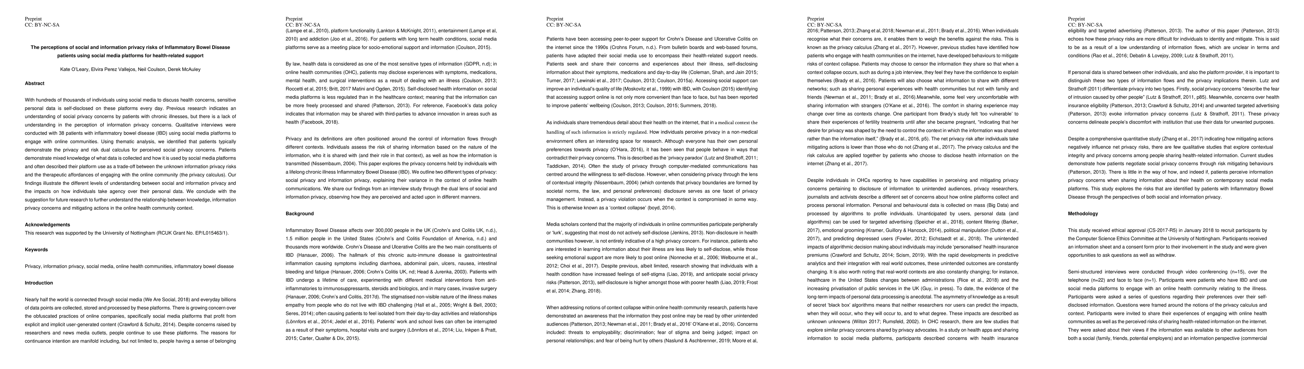 This study explores IBD patients' perceptions of social and information privacy risks when using social media for health support, revealing mixed knowledge of data collection and usage. Patients weigh the therapeutic benefits of online community engagement against unknown privacy risks, highlighting differing levels of understanding between social and information privacy.
