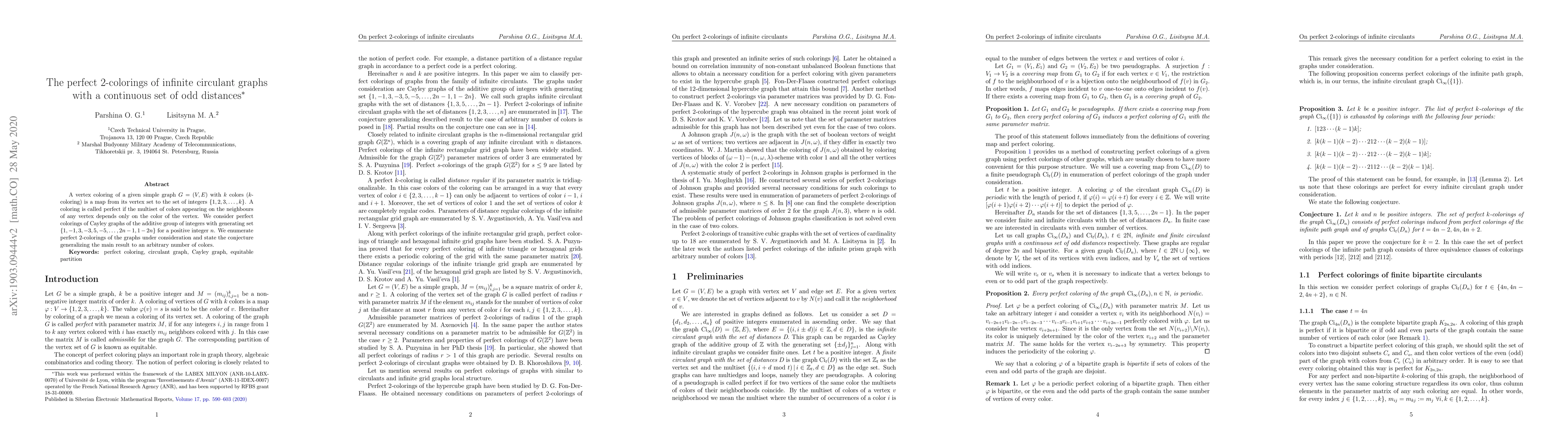 This paper studies perfect 2-colorings of infinite circulant graphs generated by a specific set of odd integers. It enumerates these perfect colorings and proposes a conjecture extending the findings to any number of colors.