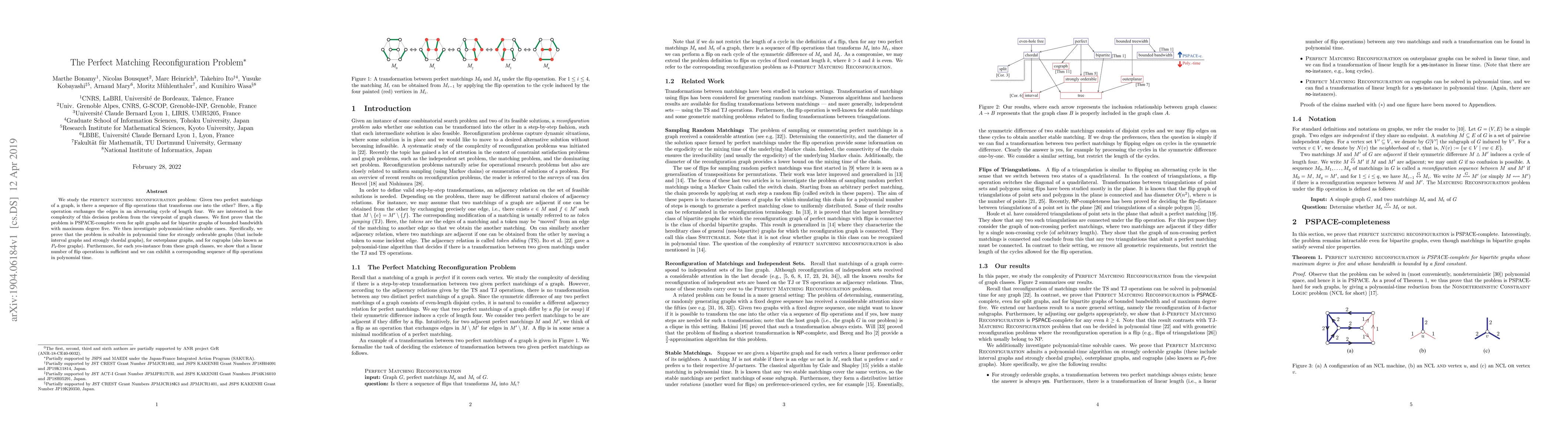 The perfect matching reconfiguration problem is PSPACE-complete for split and certain bounded bandwidth bipartite graphs, but solvable in polynomial time for strongly orderable, outerplanar, and cographs, with a linear number of flip operations. This problem explores the transformation of one perfect matching to another via flip operations in various graph classes.