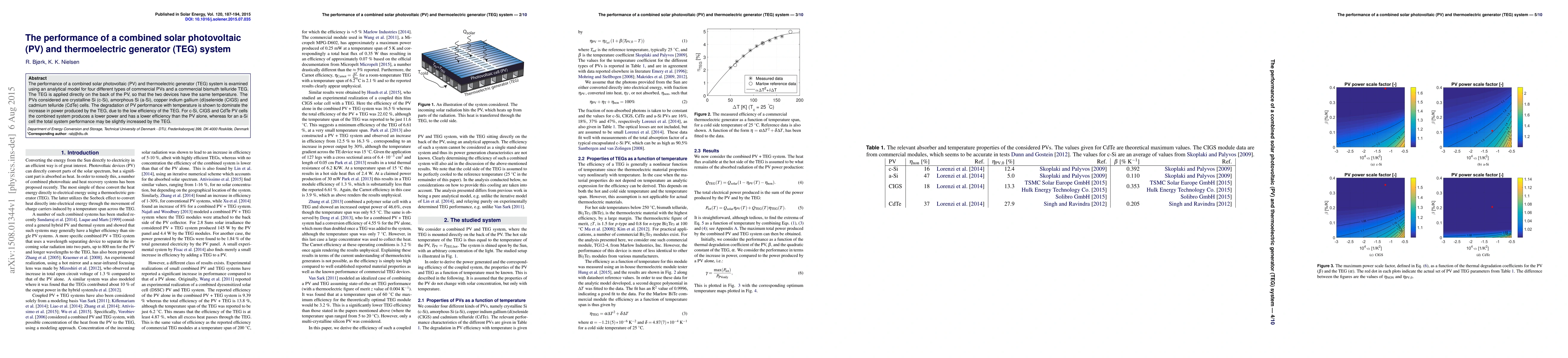 This paper evaluates a combined solar PV and TEG system using an analytical model, finding that while the TEG can increase power output, the PV's temperature-induced performance degradation often outweighs this benefit, resulting in lower overall efficiency for most PV types except amorphous Si.