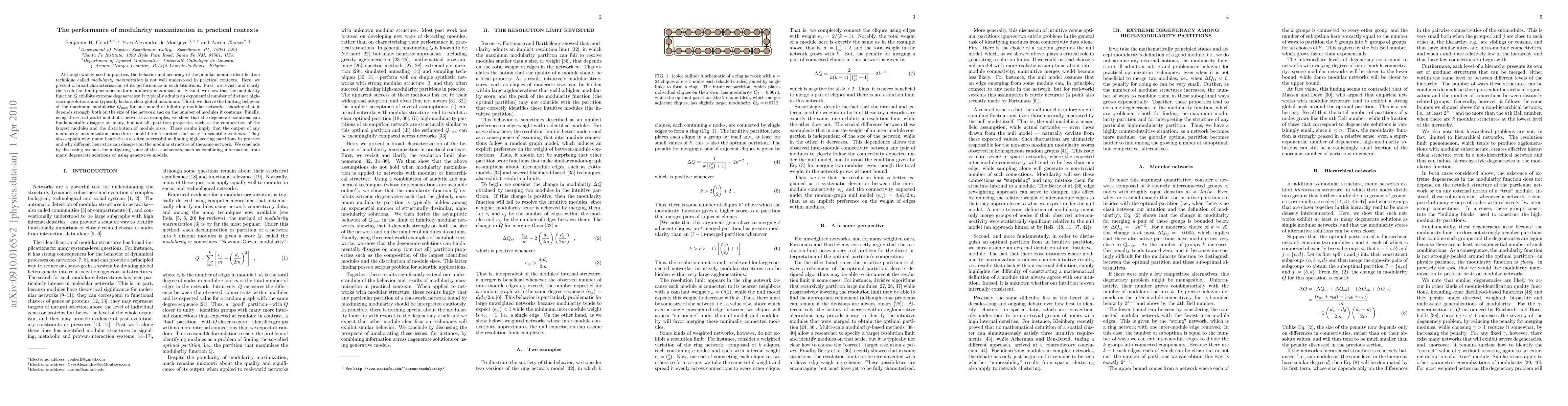 Although widely used in practice, the behavior and accuracy of the popular module identification technique called modularity maximization is not well understood in practical contexts. Here, we present a broad characterization of its performance in such situations. First, we revisit and clarify the resolution limit phenomenon for modularity maximization. Second, we show that the modularity function Q exhibits extreme degeneracies: it typically admits an exponential number of distinct high-scoring solutions and typically lacks a clear global maximum. Third, we derive the limiting behavior of the maximum modularity Q_max for one model of infinitely modular networks, showing that it depends strongly both on the size of the network and on the number of modules it contains. Finally, using three real-world metabolic networks as examples, we show that the degenerate solutions can fundamentally disagree on many, but not all, partition properties such as the composition of the largest modules and the distribution of module sizes. These results imply that the output of any modularity maximization procedure should be interpreted cautiously in scientific contexts. They also explain why many heuristics are often successful at finding high-scoring partitions in practice and why different heuristics can disagree on the modular structure of the same network. We conclude by discussing avenues for mitigating some of these behaviors, such as combining information from many degenerate solutions or using generative models.