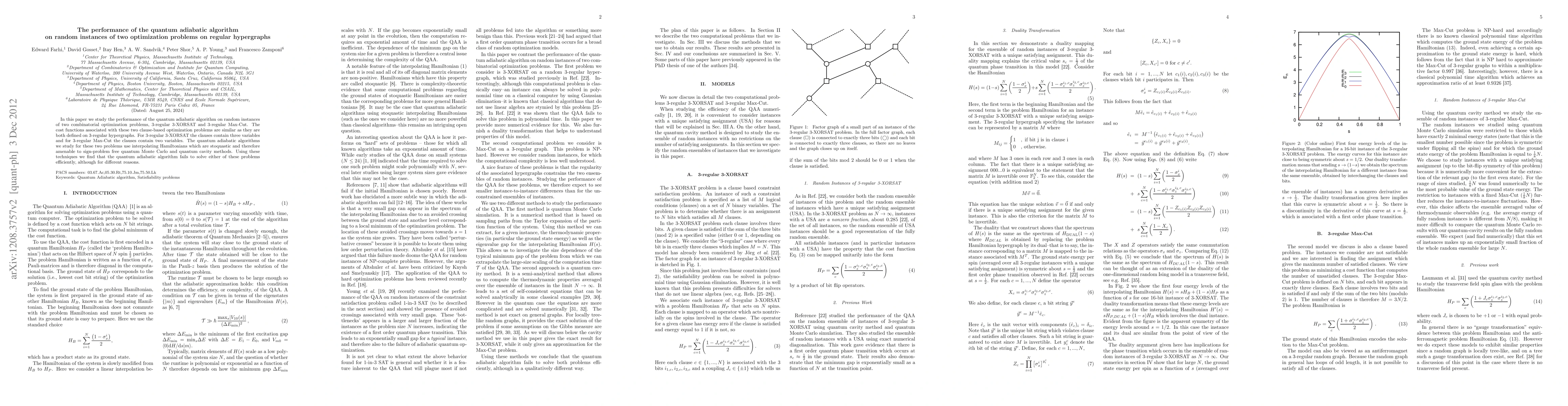 This paper investigates the quantum adiabatic algorithm's performance on random instances of 3-regular 3-XORSAT and 3-regular Max-Cut, finding that it fails to solve either problem efficiently due to different underlying reasons. The study employs interpolating Hamiltonians that are stoquastic, allowing for sign-problem free quantum simulations.