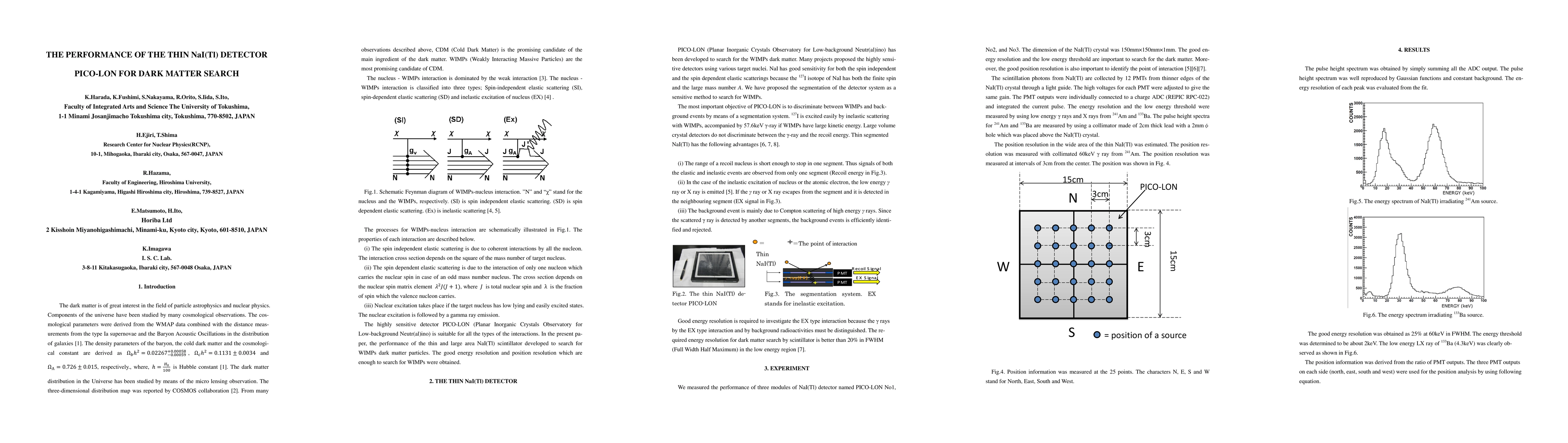 Thin and large area NaI(Tl) scintillator to search for WIMPs dark matter was developed. The performance of thin and wide area NaI(Tl) showed good enough to search for dark matter. The energy threshold was as low as 2keV and the energy resolution was about 24% in FWHM at 60keV.