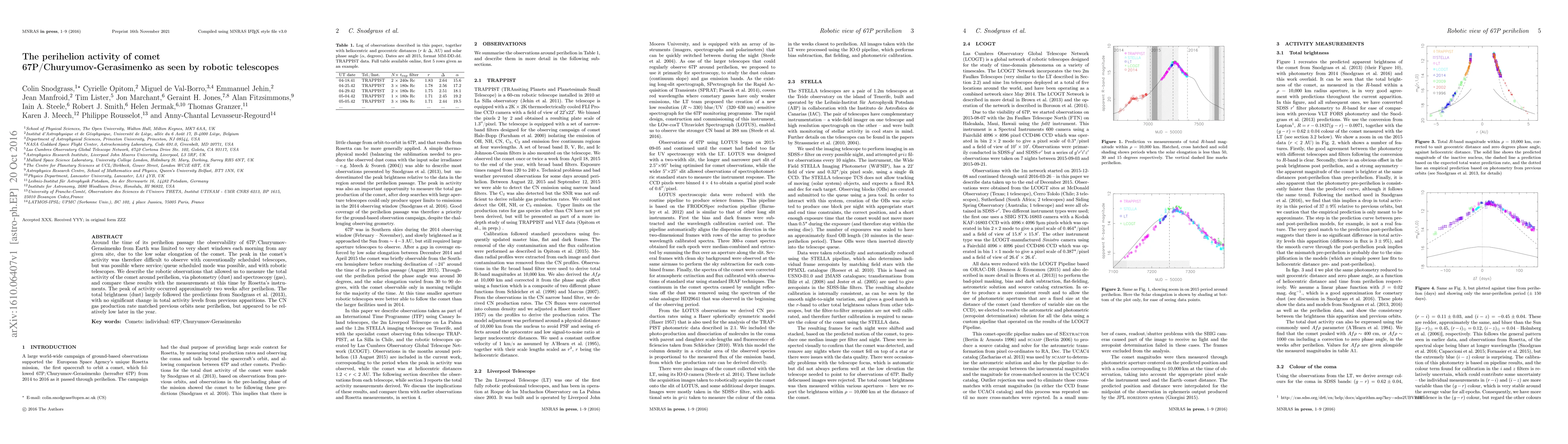 Around the time of its perihelion passage the observability of 67P/Churyumov-Gerasimenko from Earth was limited to very short windows each morning from any given site, due to the low solar elongation of the comet. The peak in the comet's activity was therefore difficult to observe with conventionally scheduled telescopes, but was possible where service/queue scheduled mode was possible, and with robotic telescopes. We describe the robotic observations that allowed us to measure the total activity of the comet around perihelion, via photometry (dust) and spectroscopy (gas), and compare these results with the measurements at this time by Rosetta's instruments. The peak of activity occurred approximately two weeks after perihelion. The total brightness (dust) largely followed the predictions from Snodgrass et al. 2013, with no significant change in total activity levels from previous apparitions. The CN gas production rate matched previous orbits near perihelion, but appeared to be relatively low later in the year.