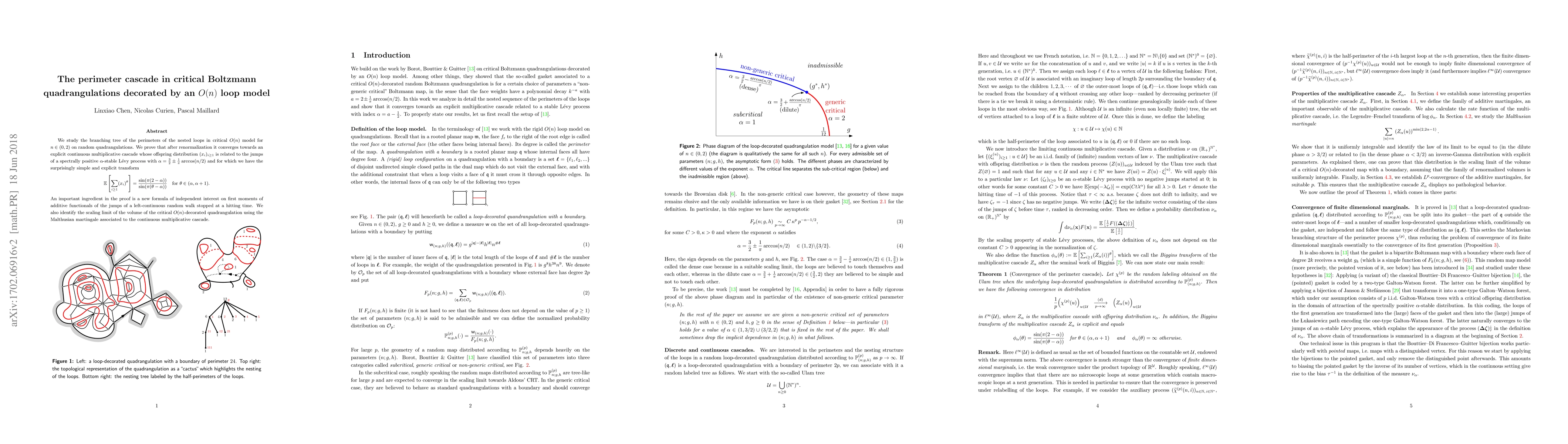 We study the branching tree of the perimeters of the nested loops in critical $O(n)$ model for $n \in (0,2)$ on random quadrangulations. We prove that after renormalization it converges towards an explicit continuous multiplicative cascade whose offspring distribution $(x_i)_{i \ge 1}$ is related to the jumps of a spectrally positive $\alpha$-stable L\'evy process with $\alpha= \frac{3}{2} \pm \frac{1}{\pi} \arccos(n/2)$ and for which we have the surprisingly simple and explicit transform $$ \mathbb E\left[\sum_{i \ge 1} (x_i)^\theta \right] = \frac{\sin(\pi (2-\alpha))}{\sin (\pi (\theta - \alpha))} \quad \mbox{for }\theta \in (\alpha, \alpha+1).$$ An important ingredient in the proof is a new formula of independent interest on first moments of additive functionals of the jumps of a left-continuous random walk stopped at a hitting time. We also identify the scaling limit of the volume of the critical $O(n)$-decorated quadrangulation using the Malthusian martingale associated to the continuous multiplicative cascade.