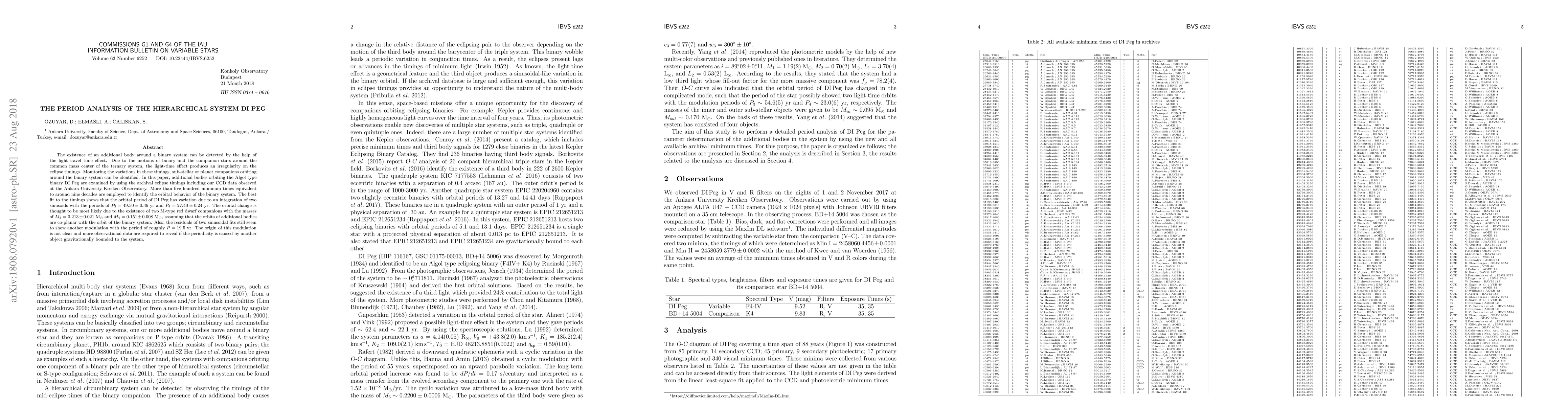 The existence of an additional body around a binary system can be detected by the help of the light-travel time effect. Due to the motions of binary and the companion stars around the common mass center of the ternary system, the light-time effect produces an irregularity on the eclipse timings. Monitoring the variations in these timings, sub-stellar or planet companions orbiting around the binary system can be identified. In this paper, additional bodies orbiting the Algol type binary DI Peg are examined by using the archival eclipse timings including our CCD data observed at the Ankara University Kreiken Observatory. More than five hundred minimum times equivalent to around nine decades are employed to identify the orbital behavior of the binary system. The best fit to the timings shows that the orbital period of DI Peg has variation due to an integration of two sinusoids with the periods of $P_3 = 49.50\pm0.36$ yr and $P_4 = 27.40\pm0.24$ yr. The orbital change is thought to be most likely due to the existence of two M-type red dwarf companions with the masses of $M_3 =0.213 \pm 0.021$ M$_\odot$ and $M_4 = 0.151 \pm 0.008$ M$_\odot$, assuming that the orbits of additional bodies are co-planar with the orbit of the binary system. Also, the residuals of two sinusoidal fits still seem to show another modulation with the period of roughly $P = 19.5$ yr. The origin of this modulation is not clear and more observational data are required to reveal if the periodicity is caused by another object gravitationally bounded to the system.