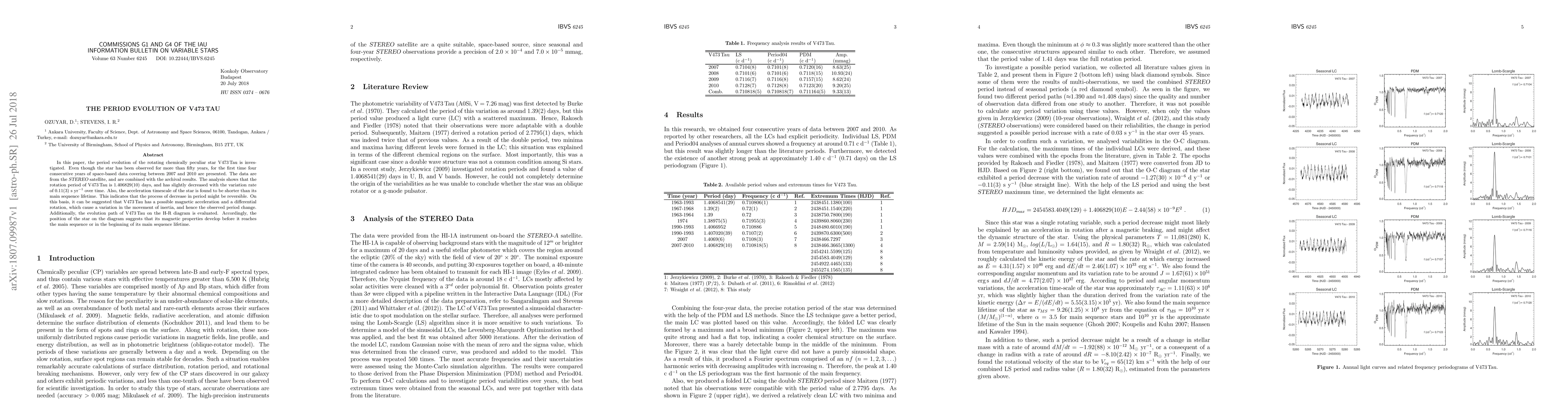 In this paper, the period evolution of the rotating chemically peculiar star V473\,Tau is investigated. Even though the star has been observed for more than fifty years, for the first time four consecutive years of space-based data covering between 2007 and 2010 are presented. The data are from the {\sl STEREO} satellite, and are combined with the archival results. The analysis shows that the rotation period of V473\,Tau is $1.406829(10)$ days, and has slightly decreased with the variation rate of 0.11(3)~s~yr$^{-1}$ over time. Also, the acceleration timescale of the star is found to be shorter than its main sequence lifetime. This indicates that the process of decrease in period might be reversible. On this basis, it can be suggested that V473\,Tau has a possible magnetic acceleration and a differential rotation, which cause a variation in the movement of inertia, and hence the observed period change. Additionally, the evolution path of V473\,Tau on the H-R diagram is evaluated. Accordingly, the position of the star on the diagram suggests that its magnetic properties develop before it reaches the main sequence or in the beginning of its main sequence lifetime.