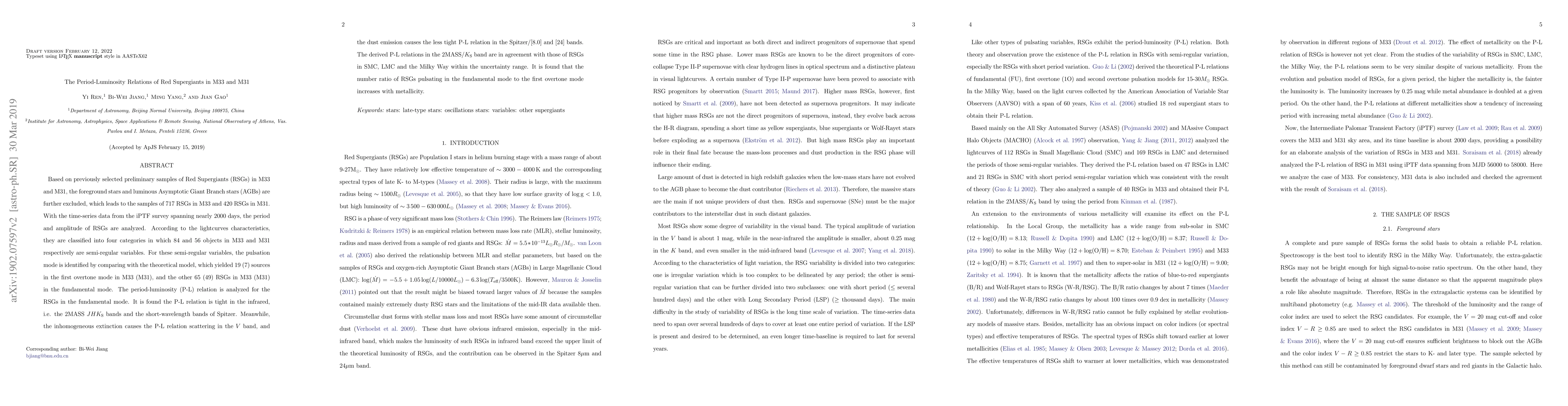 This study analyzes the period-luminosity relations of Red Supergiants (RSGs) in M33 and M31, identifying 717 and 420 RSGs respectively after excluding foreground stars and luminous AGBs. The P-L relation is found to be tight in infrared bands but scattered in optical due to extinction, with derived relations in the K band aligning with those in other galaxies. The ratio of fundamental to first overtone mode pulsators increases with metallicity.