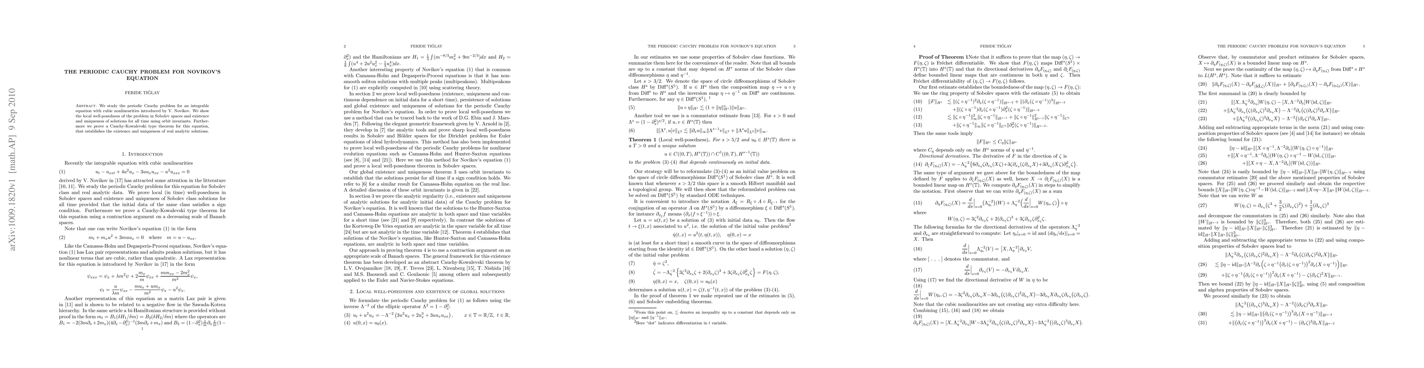 We study the periodic Cauchy problem for an integrable equation with cubic nonlinearities introduced by V. Novikov. Like the Camassa-Holm and Degasperis-Procesi equations, Novikov's equation has Lax pair representations and admits peakon solutions, but it has nonlinear terms that are cubic, rather than quadratic. We show the local well-posedness of the problem in Sobolev spaces and existence and uniqueness of solutions for all time using orbit invariants. Furthermore we prove a Cauchy-Kowalevski type theorem for this equation, that establishes the existence and uniqueness of real analytic solutions.
