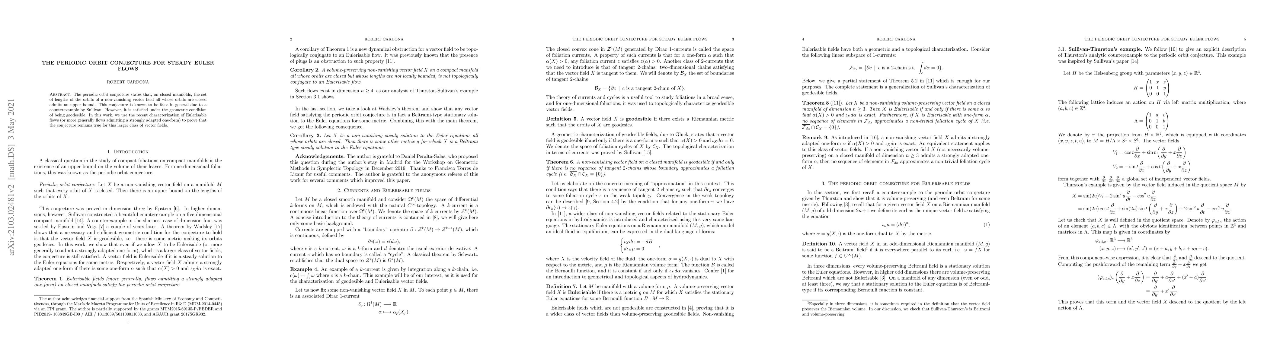 The periodic orbit conjecture posits an upper bound for the lengths of closed orbits in non-vanishing vector fields on closed manifolds. Despite being disproven in general, it holds true for geodesible and Eulerisable flows, as demonstrated by recent characterizations of such flows.