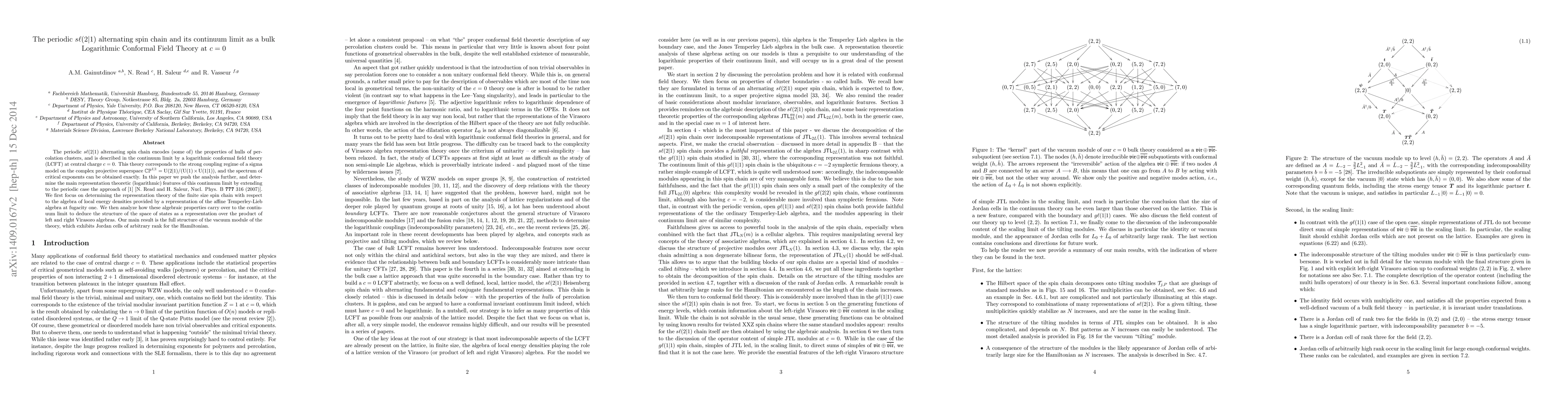 The periodic sl(2|1) alternating spin chain encodes (some of) the properties of hulls of percolation clusters, and is described in the continuum limit by a logarithmic conformal field theory (LCFT) at central charge c=0. This theory corresponds to the strong coupling regime of a sigma model on the complex projective superspace $\mathbb{CP}^{1|1} = \mathrm{U}(2|1) / (\mathrm{U}(1) \times \mathrm{U}(1|1))$, and the spectrum of critical exponents can be obtained exactly. In this paper we push the analysis further, and determine the main representation theoretic (logarithmic) features of this continuum limit by extending to the periodic case the approach of [N. Read and H. Saleur, Nucl. Phys. B 777 316 (2007)]. We first focus on determining the representation theory of the finite size spin chain with respect to the algebra of local energy densities provided by a representation of the affine Temperley-Lieb algebra at fugacity one. We then analyze how these algebraic properties carry over to the continuum limit to deduce the structure of the space of states as a representation over the product of left and right Virasoro algebras. Our main result is the full structure of the vacuum module of the theory, which exhibits Jordan cells of arbitrary rank for the Hamiltonian.