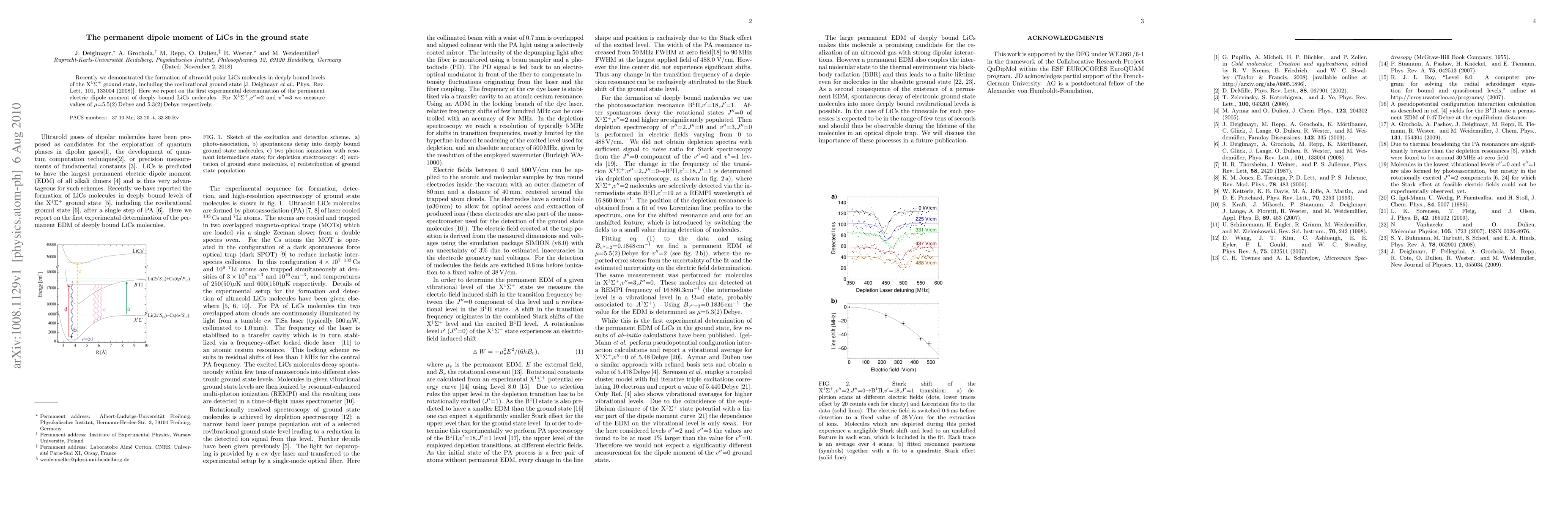 This research reports the first experimental determination of the permanent electric dipole moment of ultracold LiCs molecules in their ground state, measuring values of 5.5(2) Debye and 5.3(2) Debye for the v"=2 and v"=3 levels respectively. This study builds on previous work demonstrating the formation of these polar LiCs molecules.