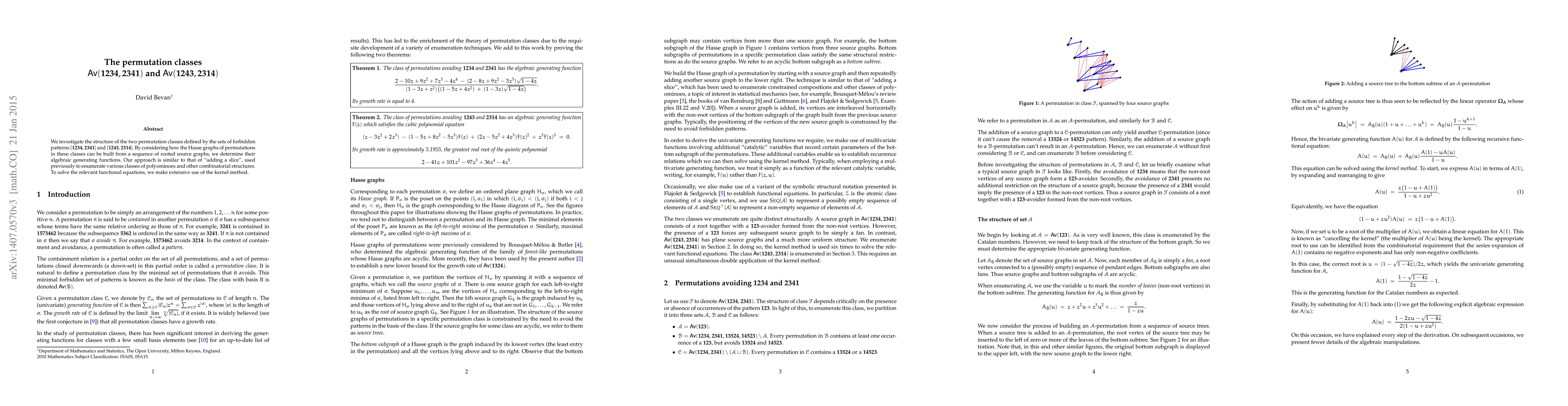 We investigate the structure of the two permutation classes defined by the sets of forbidden patterns {1234,2341} and {1243,2314}. By considering how the Hasse graphs of permutations in these classes can be built from a sequence of rooted source graphs, we determine their algebraic generating functions. Our approach is similar to that of "adding a slice", used previously to enumerate various classes of polyominoes and other combinatorial structures. To solve the relevant functional equations, we make extensive use of the kernel method.