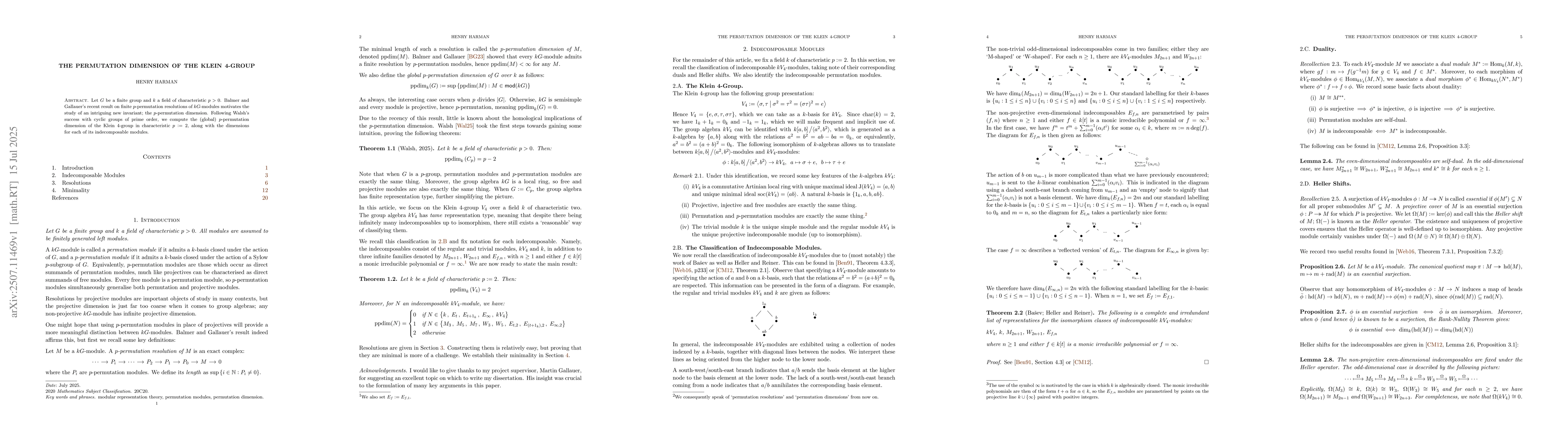 This paper calculates the 2-permutation dimension of the Klein 4-group, a finite group, using methods inspired by previous work on cyclic groups. It also determines the dimensions for each of the group's indecomposable modules in characteristic 2.