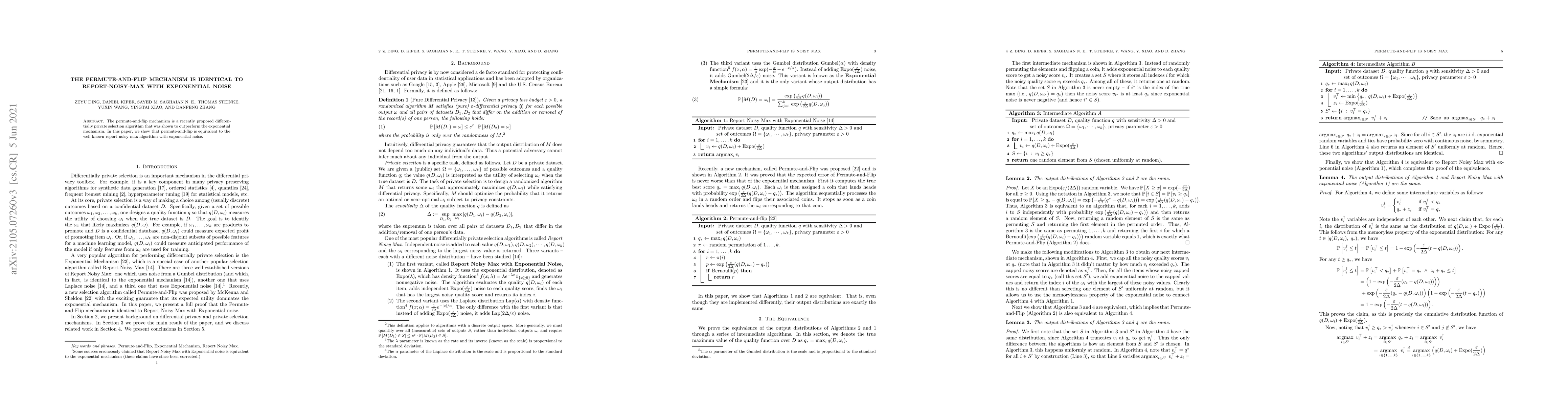 Summary: This paper demonstrates that the permute-and-flip mechanism, a novel differentially private selection algorithm, is functionally identical to the report-noisy-max algorithm with exponential noise, highlighting its equivalence and potential advantages.