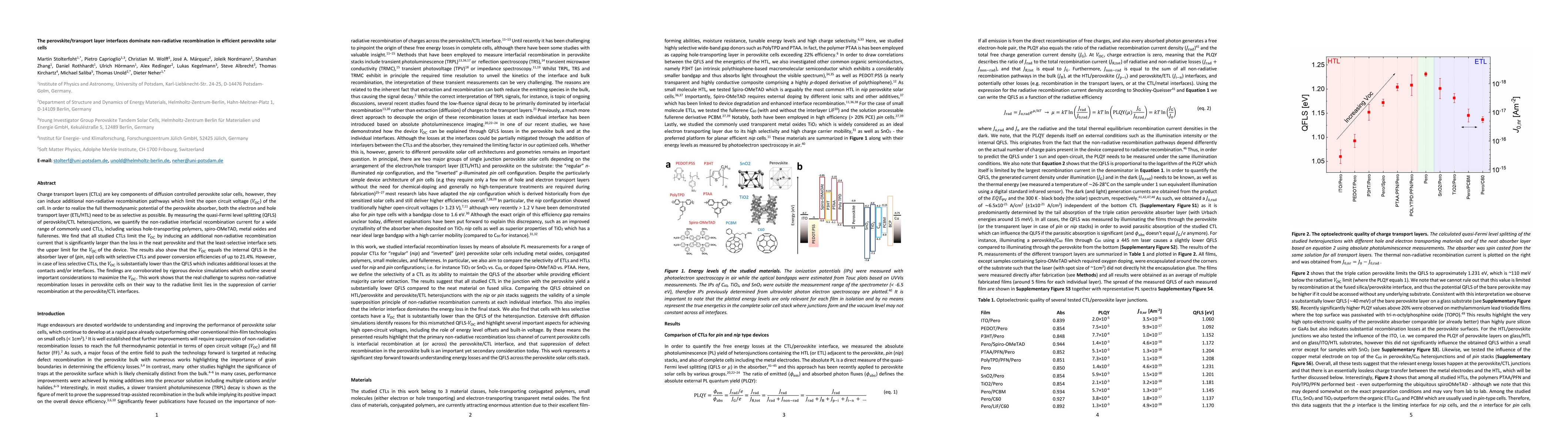 This paper investigates the impact of charge transport layers (CTLs) on non-radiative recombination in perovskite solar cells, revealing that interfaces with CTLs significantly limit the open circuit voltage (V_OC) due to additional recombination losses. The study finds that the least-selective CTL interface sets the V_OC limit, emphasizing the need for selective transport layers to achieve higher efficiencies.