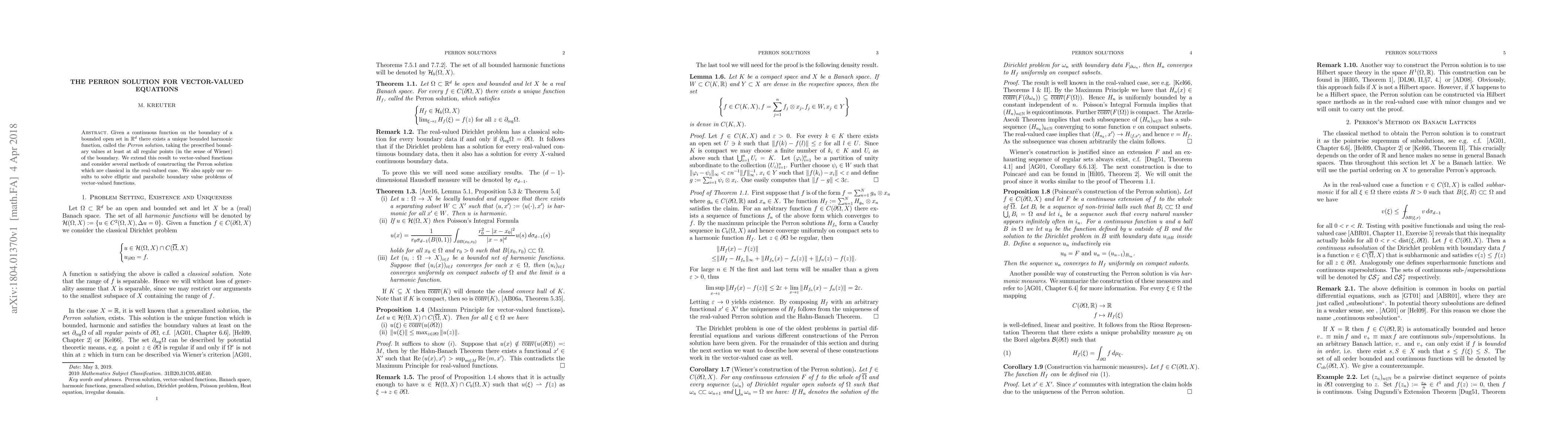 A unique bounded harmonic function (Perron solution) exists for vector-valued equations with prescribed boundary values, extending classical methods to vector functions.