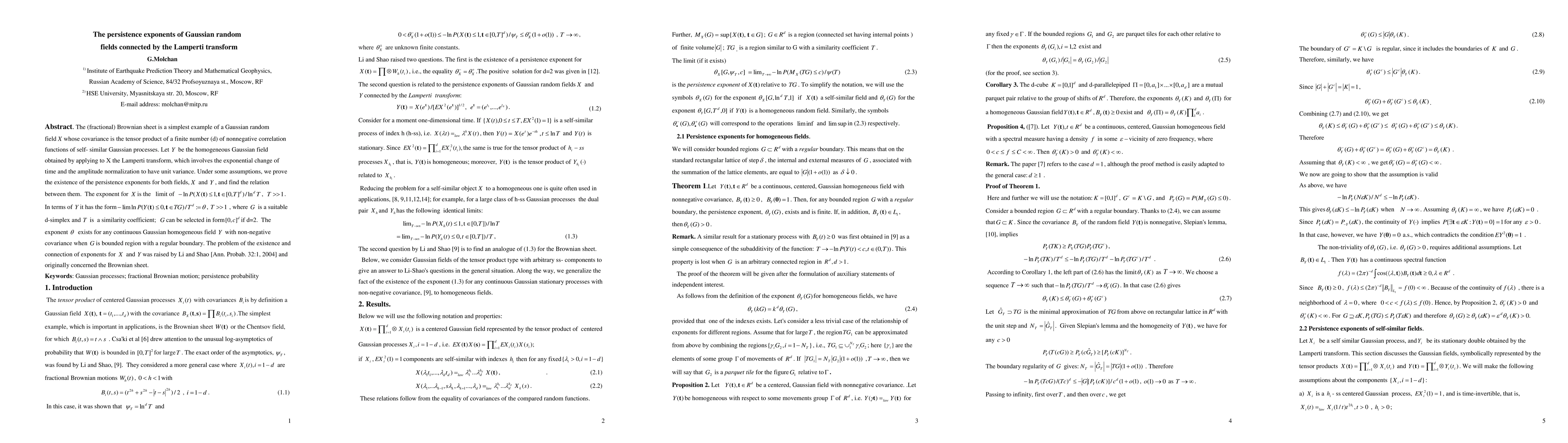 The (fractional) Brownian sheet is a simplest example of a Gaussian random field X whose covariance is the tensor product of a finite number (d) of nonnegative correlation functions of self-similar Gaussian processes. Let Y be the homogeneous Gaussian field obtained by applying to X the Lamperti transform, which involves the exponential change of time and the amplitude normalization to have unit variance. Under some assumptions, we prove the existence of the persistence exponents for both fields, X and Y, and find the relation between them. The exponent for X is the limit of ln1/P{X(t)<1, t in [0,T]^d}/(lnT)^d, T>>1. In terms of Y it has the form lim ln1/P{Y(t)<0,t in TG}/T^d:=Q, T>>1, where G is a suitable d-simplex and T is a similarity coefficient; G can be selected in form [0,c]^d if d=2 . The exponent Q exists for any continuous Gaussian homogeneous field Y with non-negative covariance when G is bounded region with a regular boundary. The problem of the existence and connection of exponents for X and Y was raised by Li and Shao [Ann. Probab. 32:1, 2004] and originally concerned the Brownian sheet.