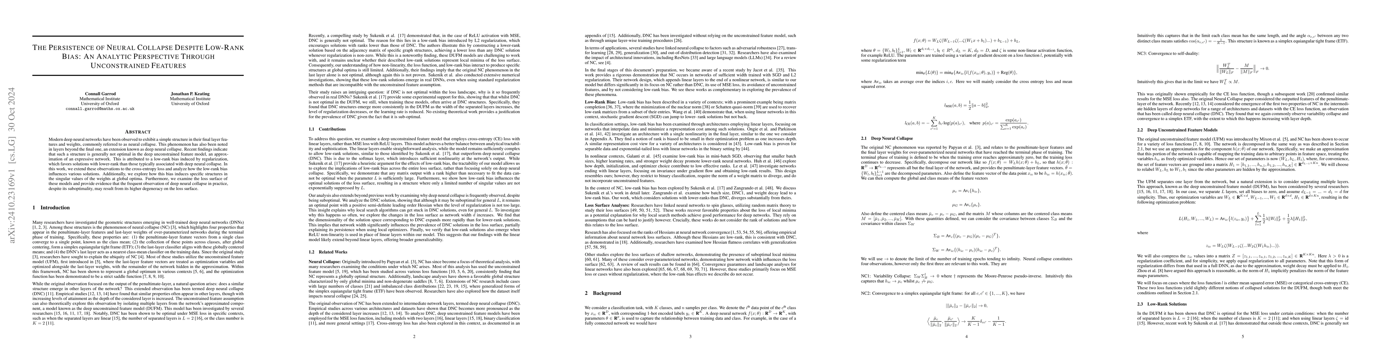 Modern deep neural networks have been observed to exhibit a simple structure in their final layer features and weights, commonly referred to as neural collapse. This phenomenon has also been noted in layers beyond the final one, an extension known as deep neural collapse. Recent findings indicate that such a structure is generally not optimal in the deep unconstrained feature model, an approximation of an expressive network. This is attributed to a low-rank bias induced by regularization, which favors solutions with lower-rank than those typically associated with deep neural collapse. In this work, we extend these observations to the cross-entropy loss and analyze how the low-rank bias influences various solutions. Additionally, we explore how this bias induces specific structures in the singular values of the weights at global optima. Furthermore, we examine the loss surface of these models and provide evidence that the frequent observation of deep neural collapse in practice, despite its suboptimality, may result from its higher degeneracy on the loss surface.