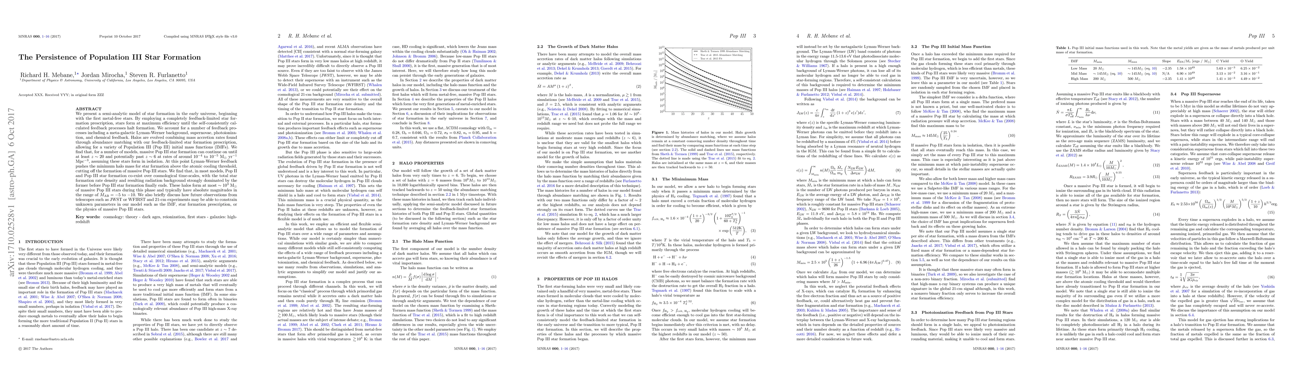 This paper uses a semi-analytic model to explore the persistence of Population III star formation in the early universe, showing that massive stars can form until at least $z \sim 20$ before feedback processes halt their creation. Future observations may help refine the model's parameters.