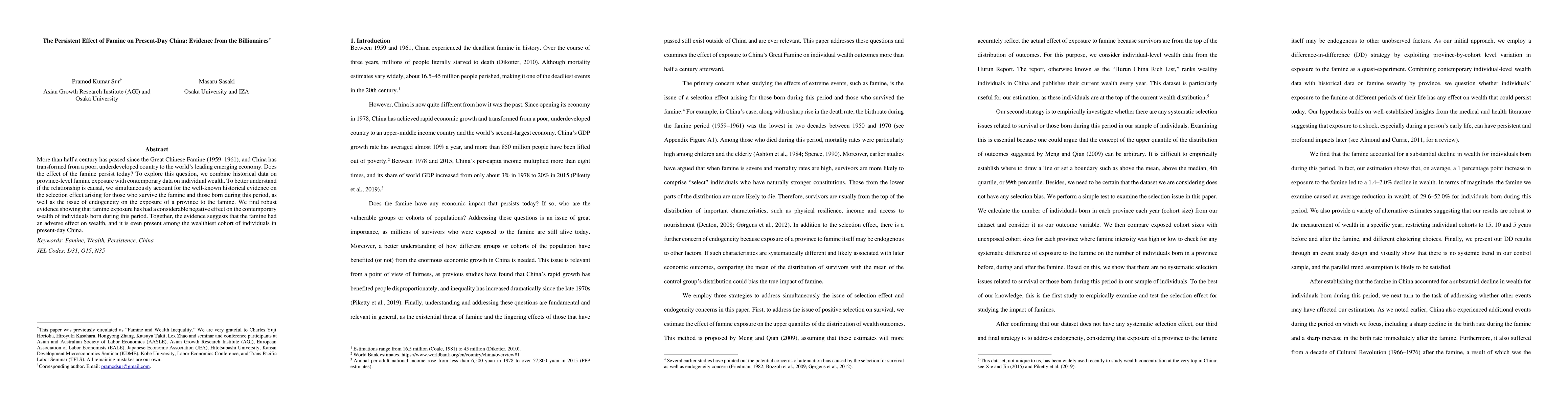 More than half a century has passed since the Great Chinese Famine (1959-1961), and China has transformed from a poor, underdeveloped country to the world's leading emerging economy. Does the effect of the famine persist today? To explore this question, we combine historical data on province-level famine exposure with contemporary data on individual wealth. To better understand if the relationship is causal, we simultaneously account for the well-known historical evidence on the selection effect arising for those who survive the famine and those born during this period, as well as the issue of endogeneity on the exposure of a province to the famine. We find robust evidence showing that famine exposure has had a considerable negative effect on the contemporary wealth of individuals born during this period. Together, the evidence suggests that the famine had an adverse effect on wealth, and it is even present among the wealthiest cohort of individuals in present-day China.
