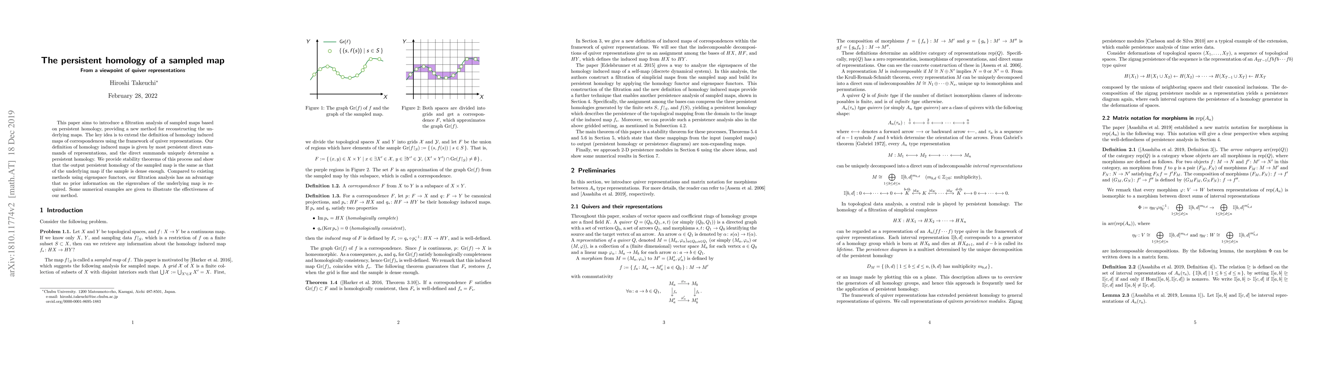 This paper proposes a filtration analysis of sampled maps using persistent homology and quiver representations, offering a new method for reconstructing underlying maps without prior eigenvalue information. It demonstrates stability theorems and shows that dense sampling preserves the persistent homology of the underlying map.