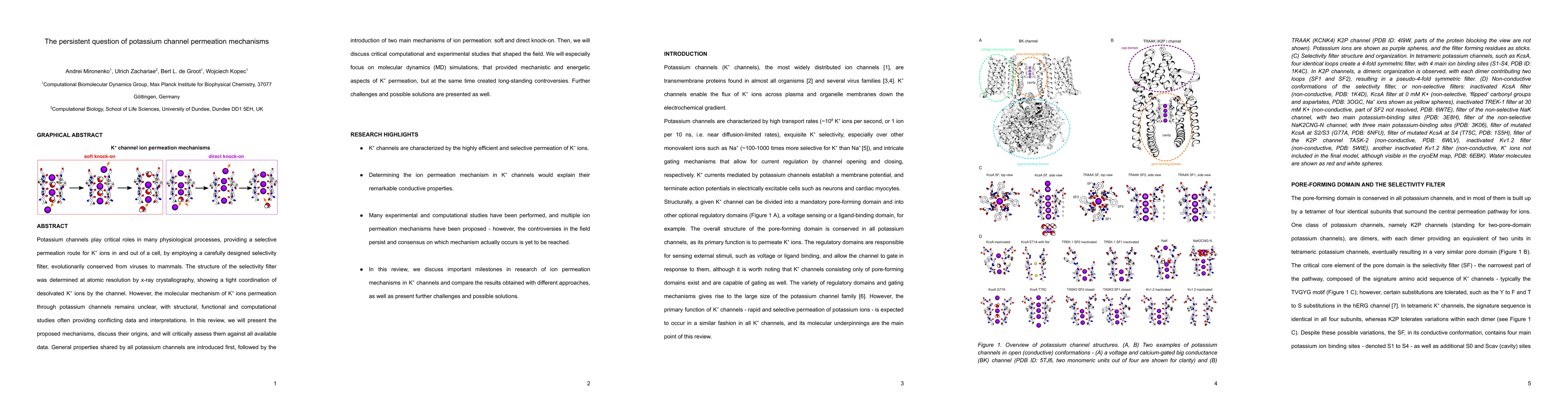 This review paper explores the permeation mechanisms of potassium channels, crucial for cellular functions. It critically assesses proposed mechanisms, focusing on soft and direct knock-on models, and discusses controversies from structural, functional, and computational studies, particularly molecular dynamics simulations.