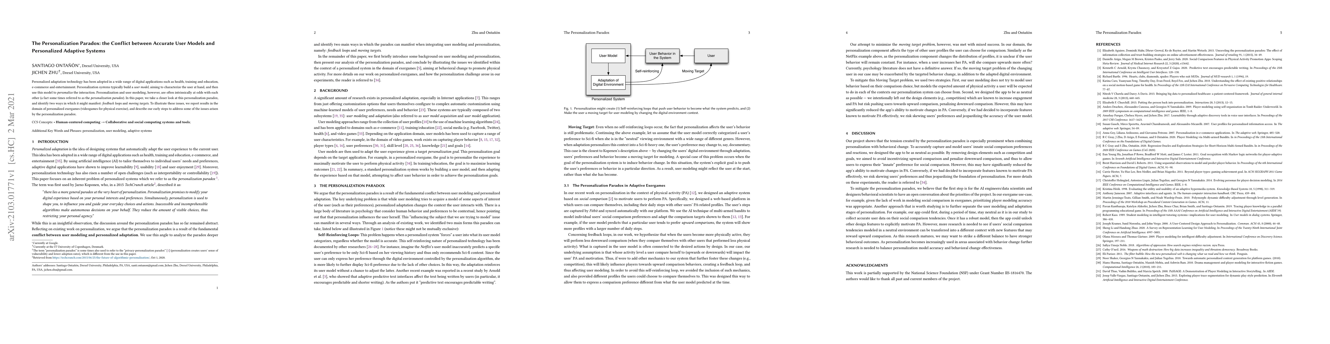 Personalized adaptation technology has been adopted in a wide range of digital applications such as health, training and education, e-commerce and entertainment. Personalization systems typically build a user model, aiming to characterize the user at hand, and then use this model to personalize the interaction. Personalization and user modeling, however, are often intrinsically at odds with each other (a fact some times referred to as the personalization paradox). In this paper, we take a closer look at this personalization paradox, and identify two ways in which it might manifest: feedback loops and moving targets. To illustrate these issues, we report results in the domain of personalized exergames (videogames for physical exercise), and describe our early steps to address some of the issues arisen by the personalization paradox.
