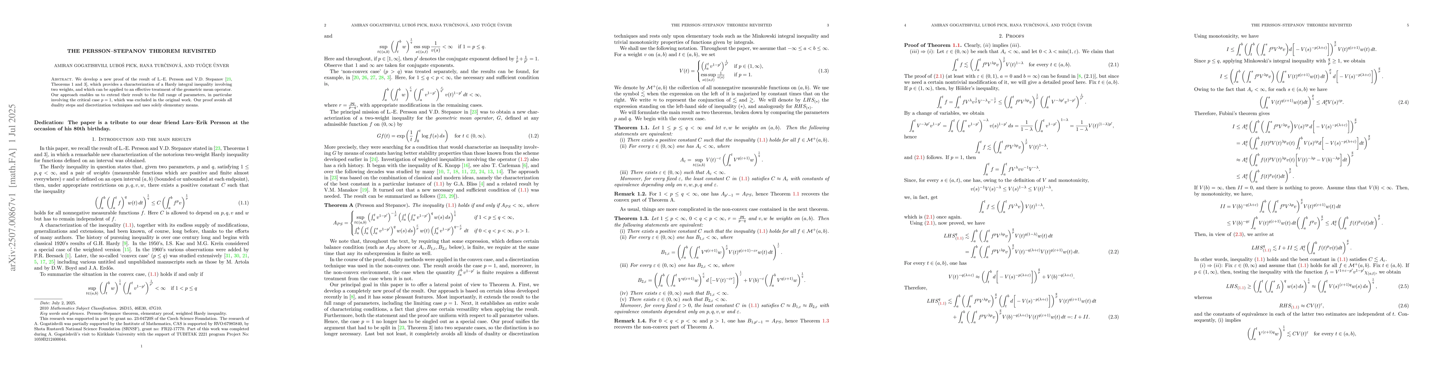 We develop a new proof of the result of L.-E.~Persson and V.D.~Stepanov \cite[Theorems 1 and 3]{Per:02}, which provides a characterization of a Hardy integral inequality involving two weights, and which can be applied to an effective treatment of the geometric mean operator. Our approach enables us to extend their result to the full range of parameters, in particular involving the critical case $p=1$, which was excluded in the original work. Our proof avoids all duality steps and discretization techniques and uses solely elementary means.